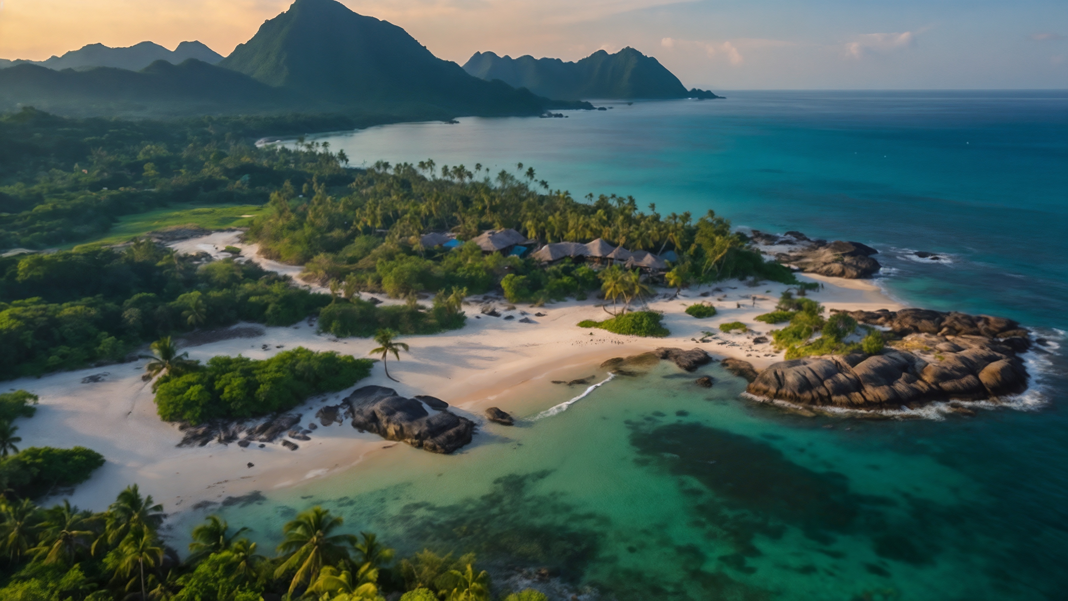 An aerial view shows an island with lush greenery, white sandy beaches, and clear blue waters. Coral reefs surround the beach, while rocky outcroppings, limestone cliffs, and tropical rainforests line the ocean’s edge. A vintage luxury hotel sits among palm trees on the beach, with huts on rocks. The scene is set against a picturesque sunset.
