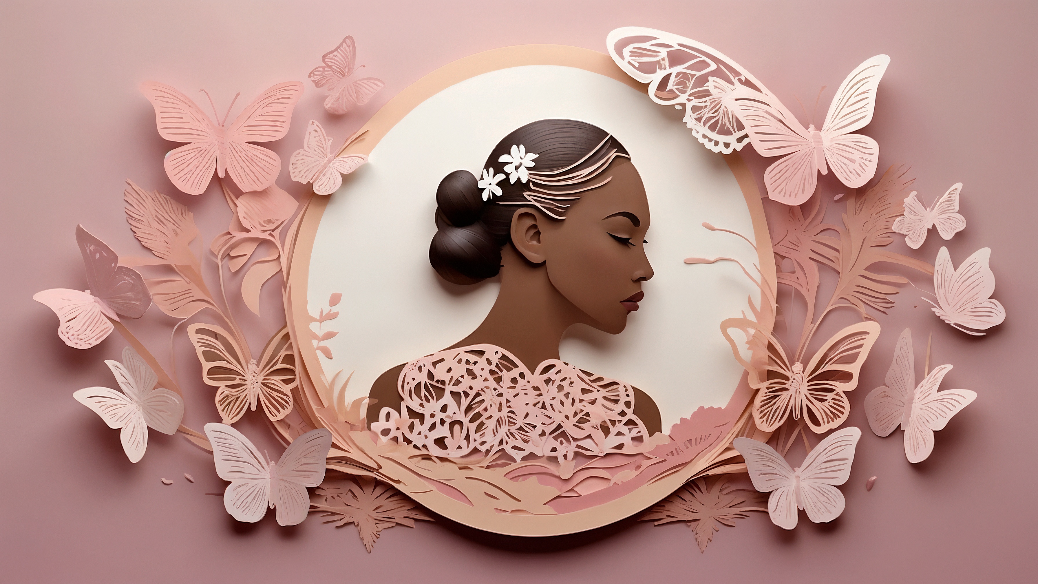 A delicate paper cutout portrait features an African American woman surrounded by butterflies, with lace-like patterns and pastel pink hues. The artwork blends paper art with traditional craft, capturing nature’s graceful curves through detailed shading and soft lighting. The composition symbolizes beauty, growth, and strength, while the elegant textures and soft palette create a timeless, serene visual.