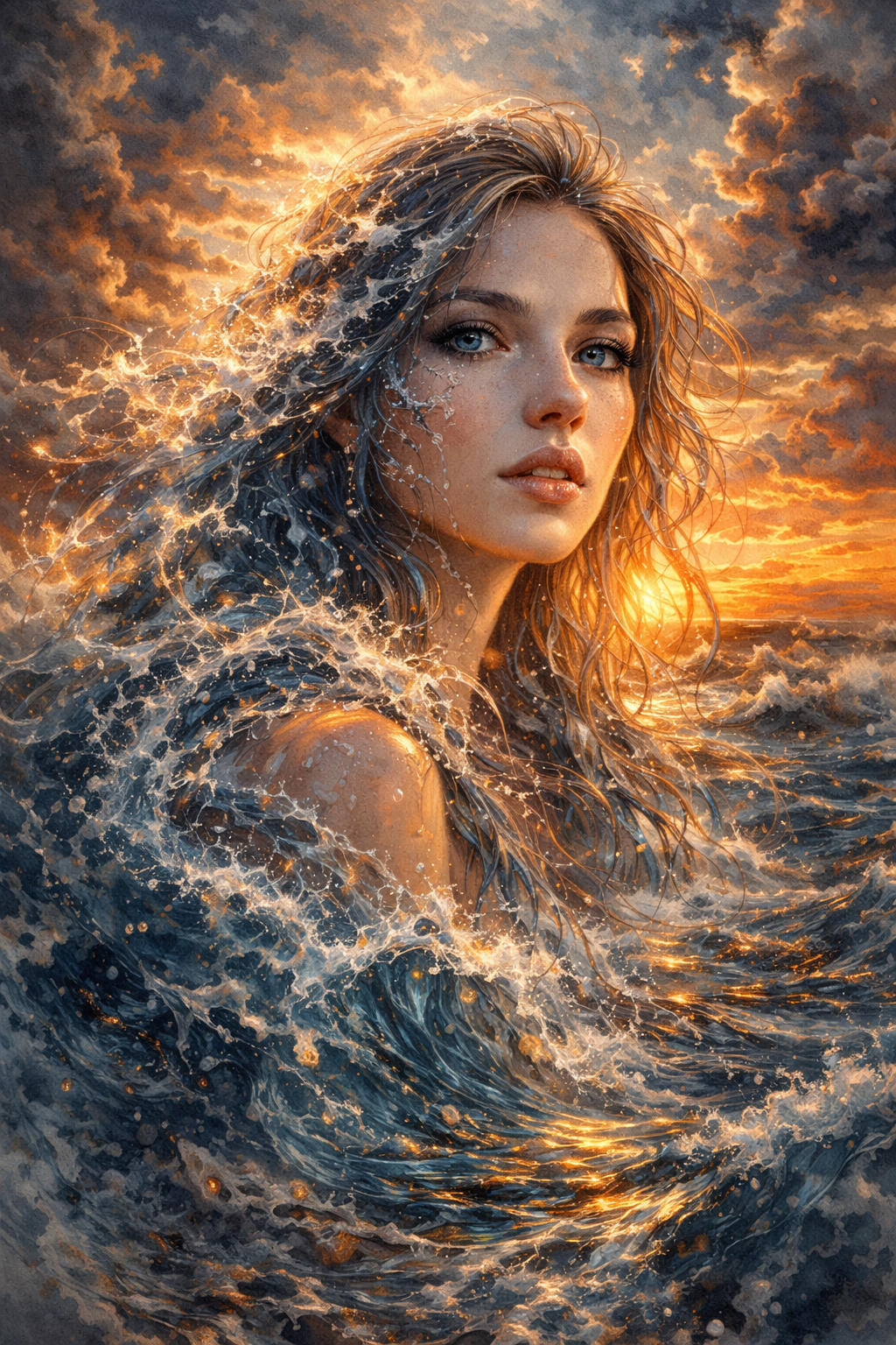 This free AI generated digital portrait captures a surreal scene of a woman merging with ocean waves at sunset. The lighting, water texture, and atmospheric clouds create an emotional and captivating visual.