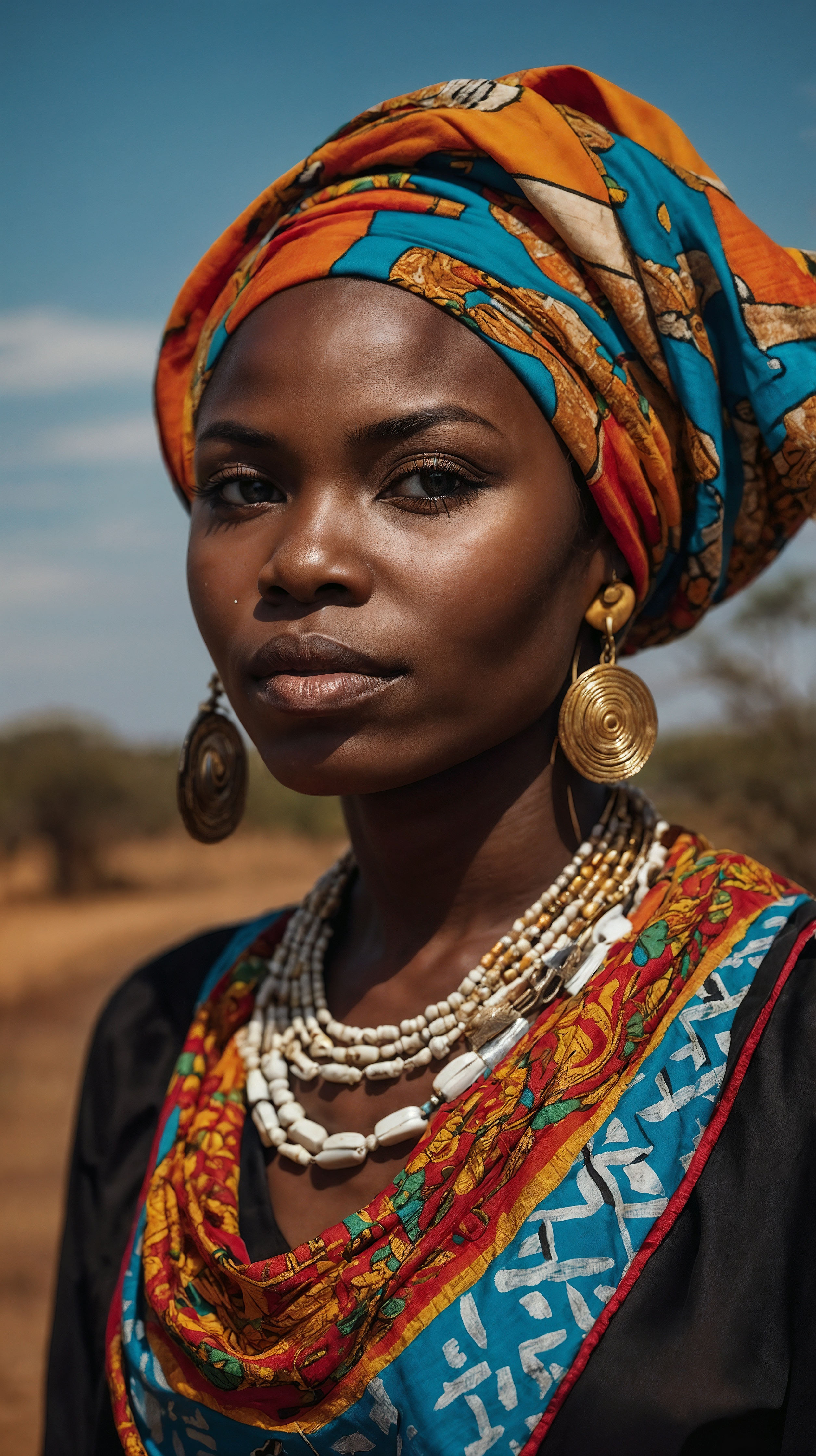 A beautiful African woman wears traditional attire with large gold earrings and colorful beaded necklaces. She stands outdoors against a vast savannah under a clear blue sky. Her headscarf covers one side of her hair, highlighting her dark skin and warm facial tones.