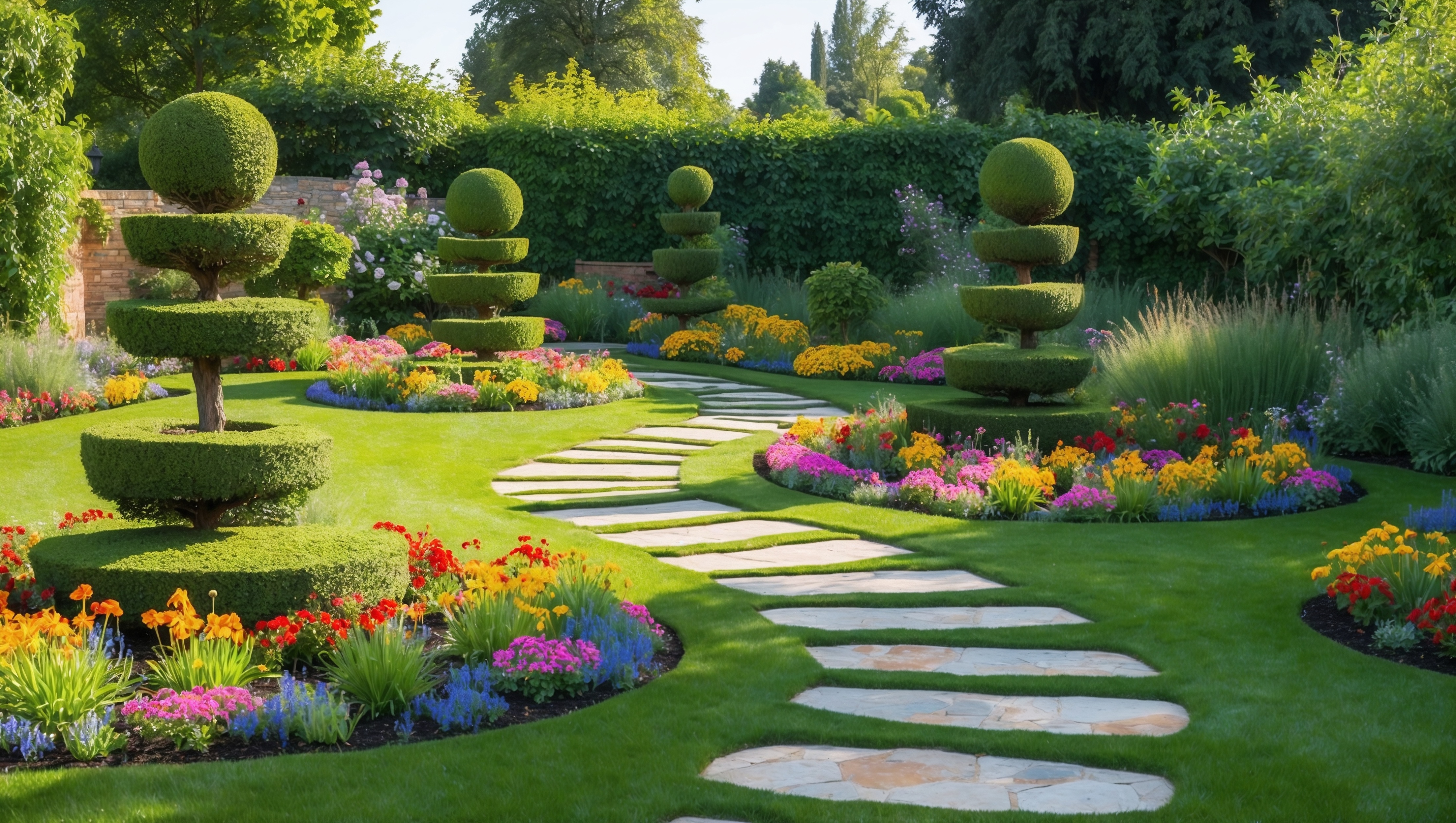 A beautiful ornamental garden features lush green grass, colorful flowers, and topiary trees shaped into round bushes. A white stone path winds through the garden, leading to an entrance at the far end.