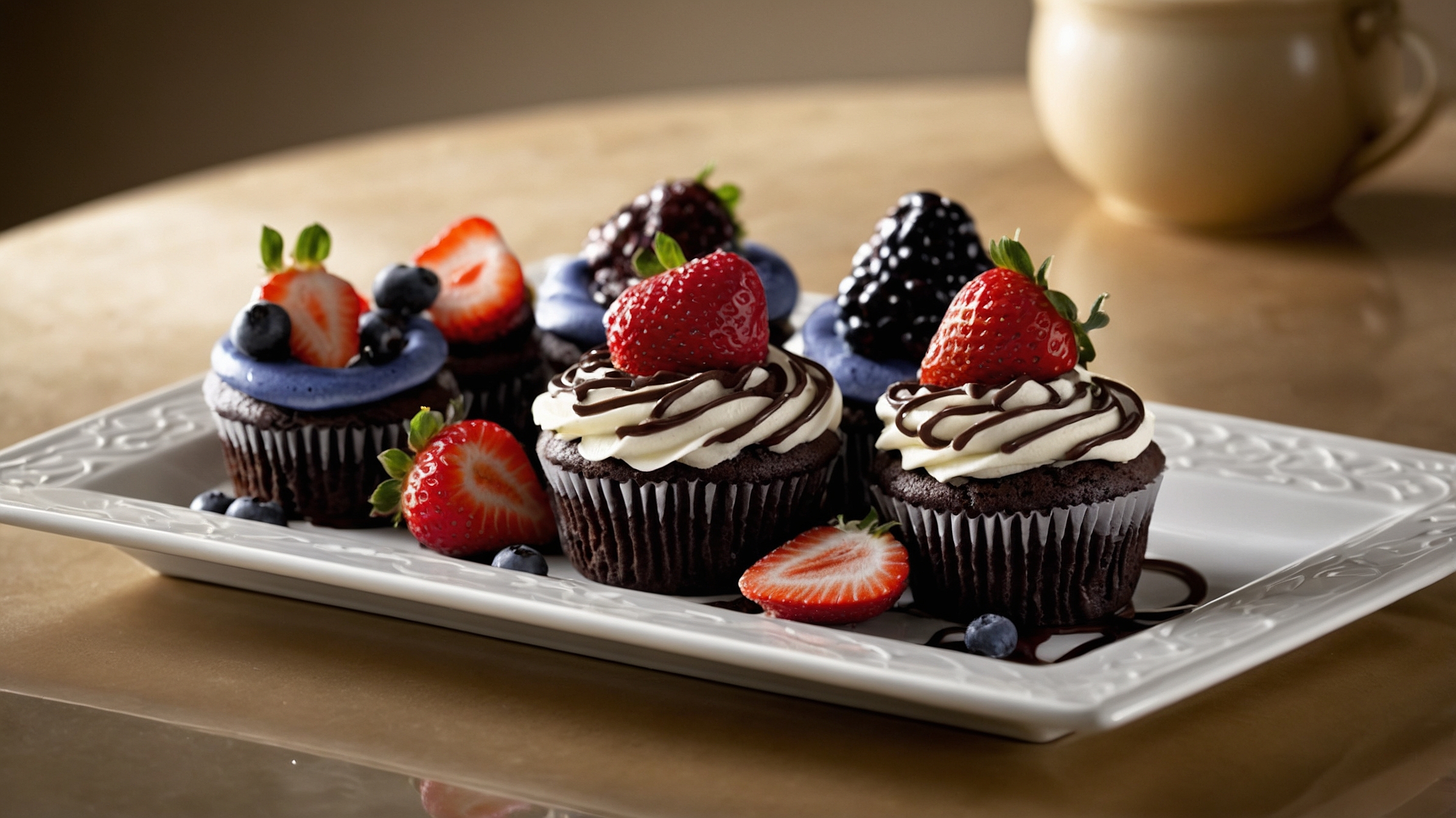 afternoon teablueberriescoffee pairingcream cheese frostingcupcake presentationdark chocolate cupcakeselegant dessertfood photographyfresh berriesgourmet treatsrich colorssquare platterstrawberriessweet breakfast
