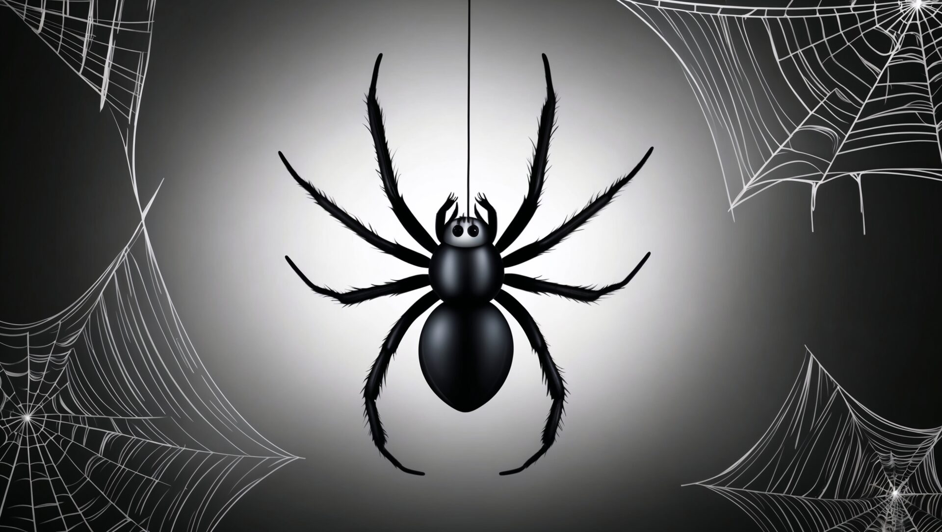 A 3D vector image of a black spider hanging from a web, set against a grey background. This Halloween-themed design features intricate details of the spider and web, creating a spooky atmosphere.