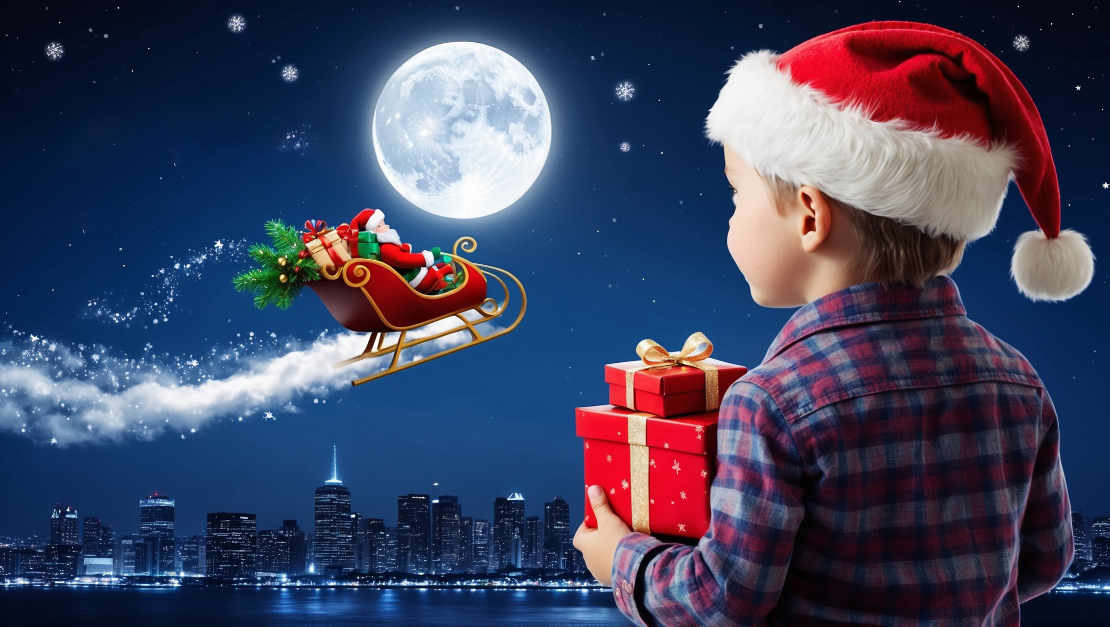 Free AI Image: Photo of a boy holding a Christmas present in his hand, wearing a Santa hat and looking at a flying sleigh with Santa Claus on the moon above a city background.