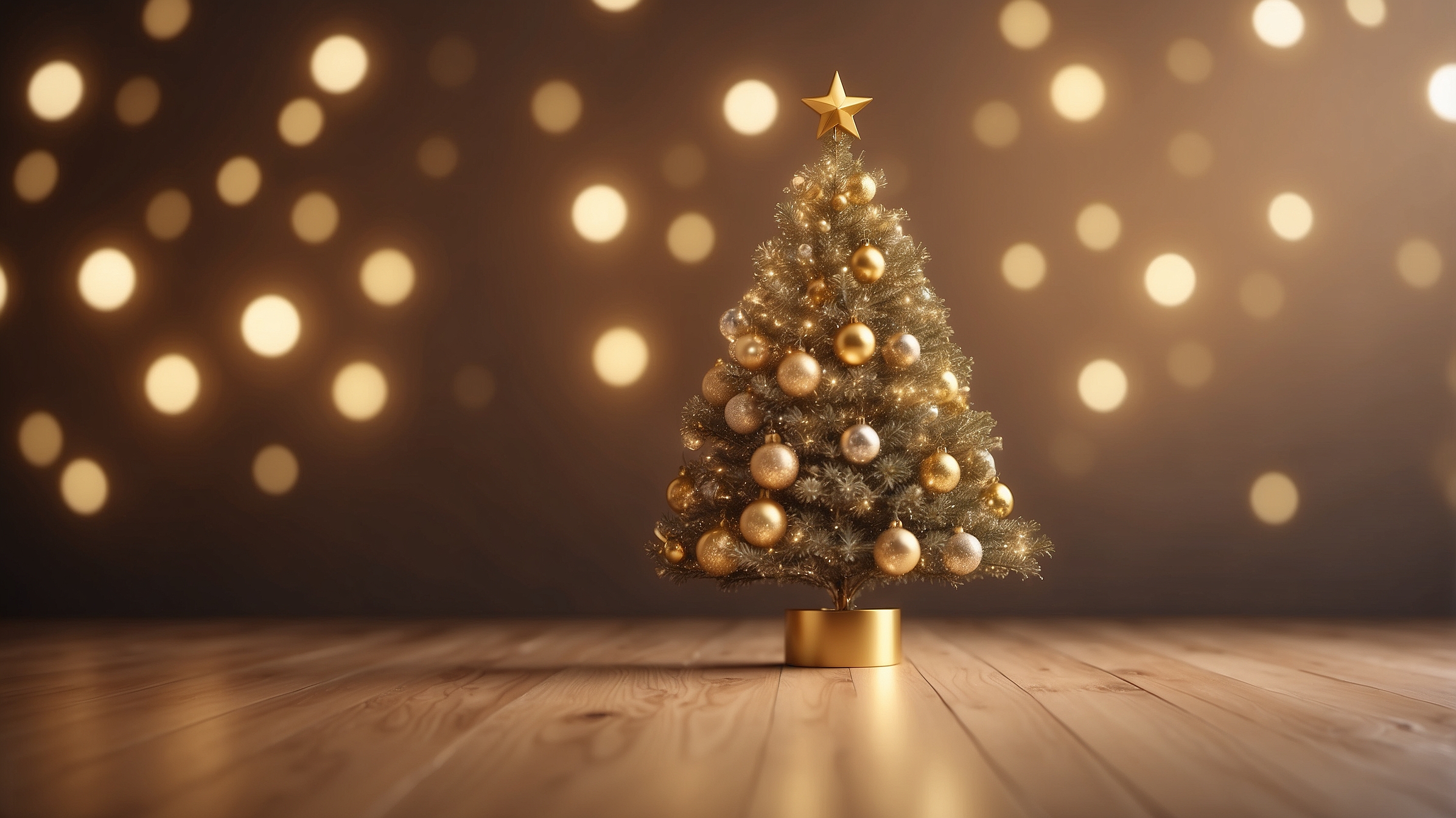 Free AI Image: Christmas tree with golden decorations on a wooden table against a blurred lights background. Christmas concept. Shiny gold and brown colors. New Year, Christmas, winter holiday party design element.