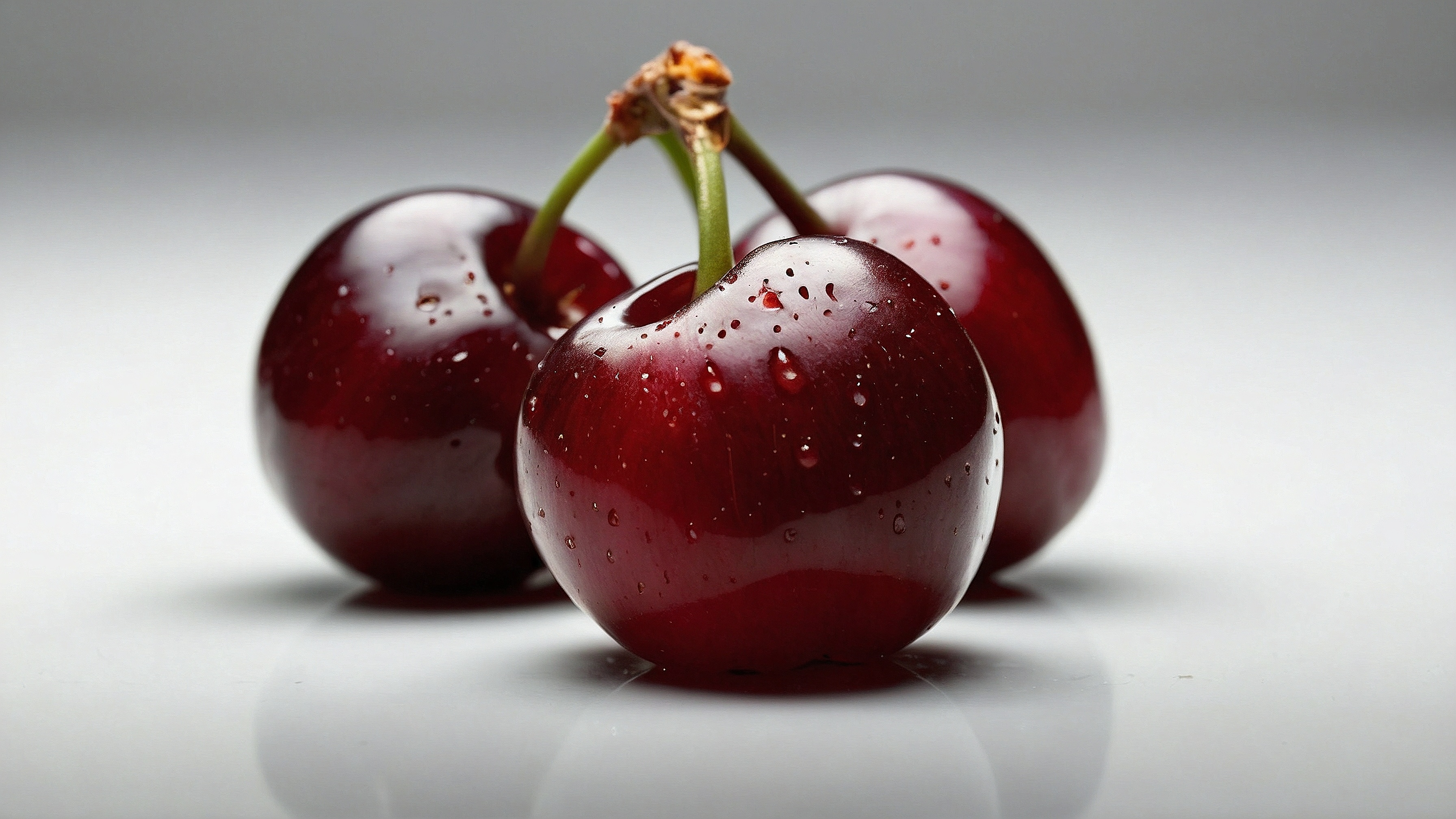 Free AI Image: A close-up shot of three fresh cherries, their deep red hues shining under the soft light on a white background, creating an attractive and appetizing visual appeal for commercial use.