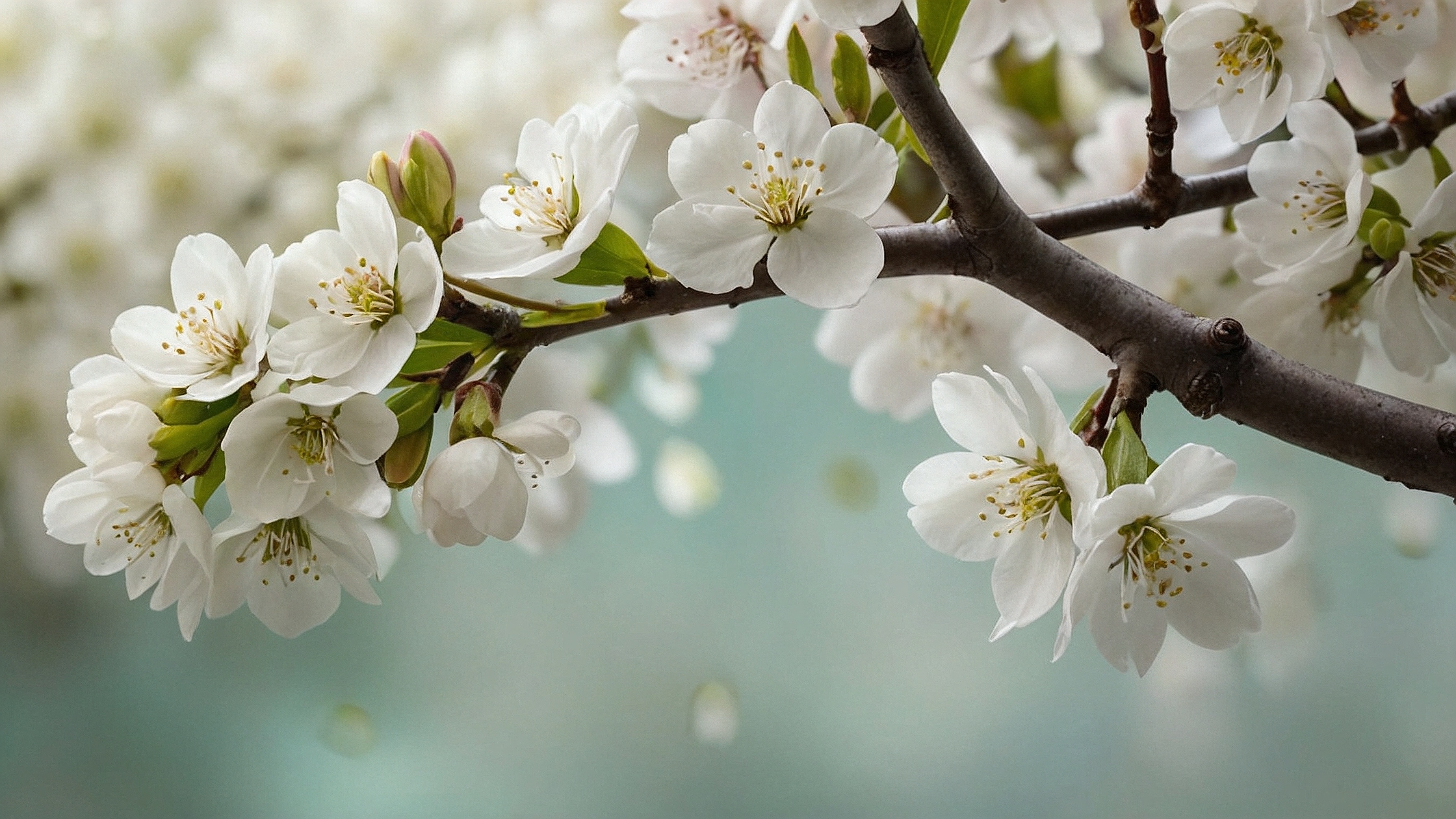 Free AI Image: Close-up of white flowers on a cherry tree branch, with a bokeh background, high-resolution photography.