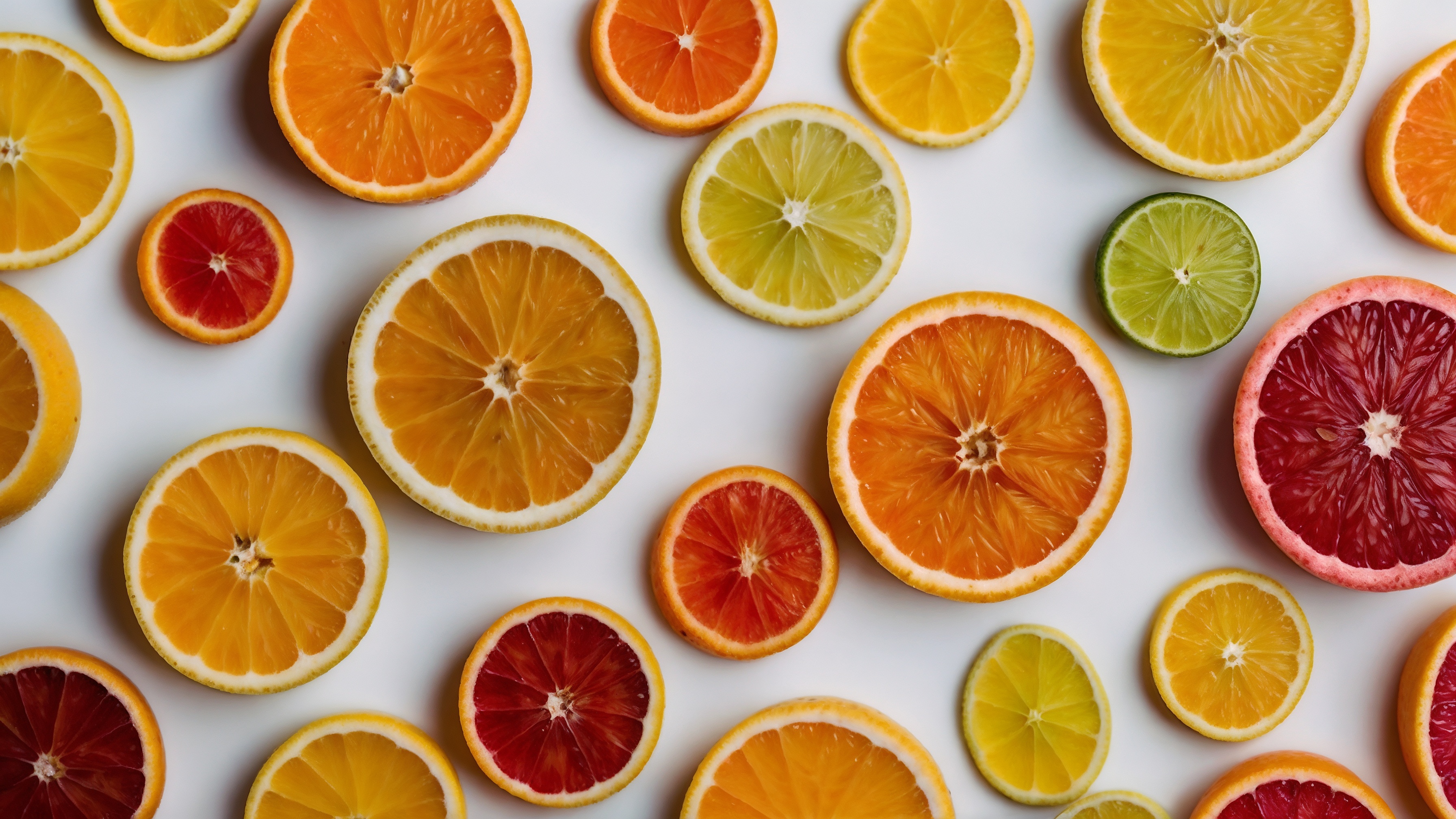Free AI Image: A vibrant pattern of citrus slices against a white background, showcasing the diversity and beauty of fruit colors.