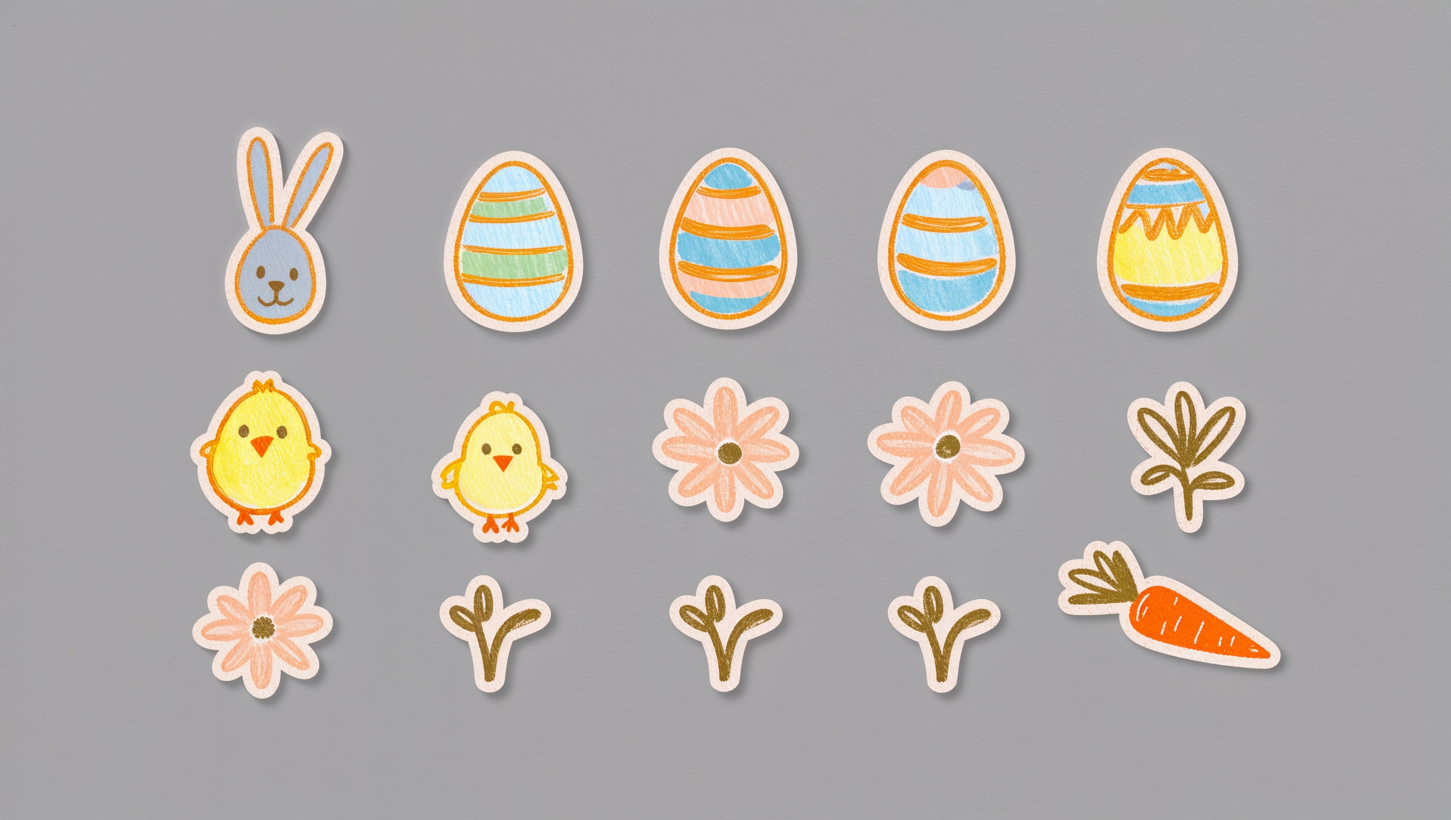 A set of cute Easter stickers in pastel colors features a simple flat design. The sheet includes eggs, chicks, flowers, and carrots.