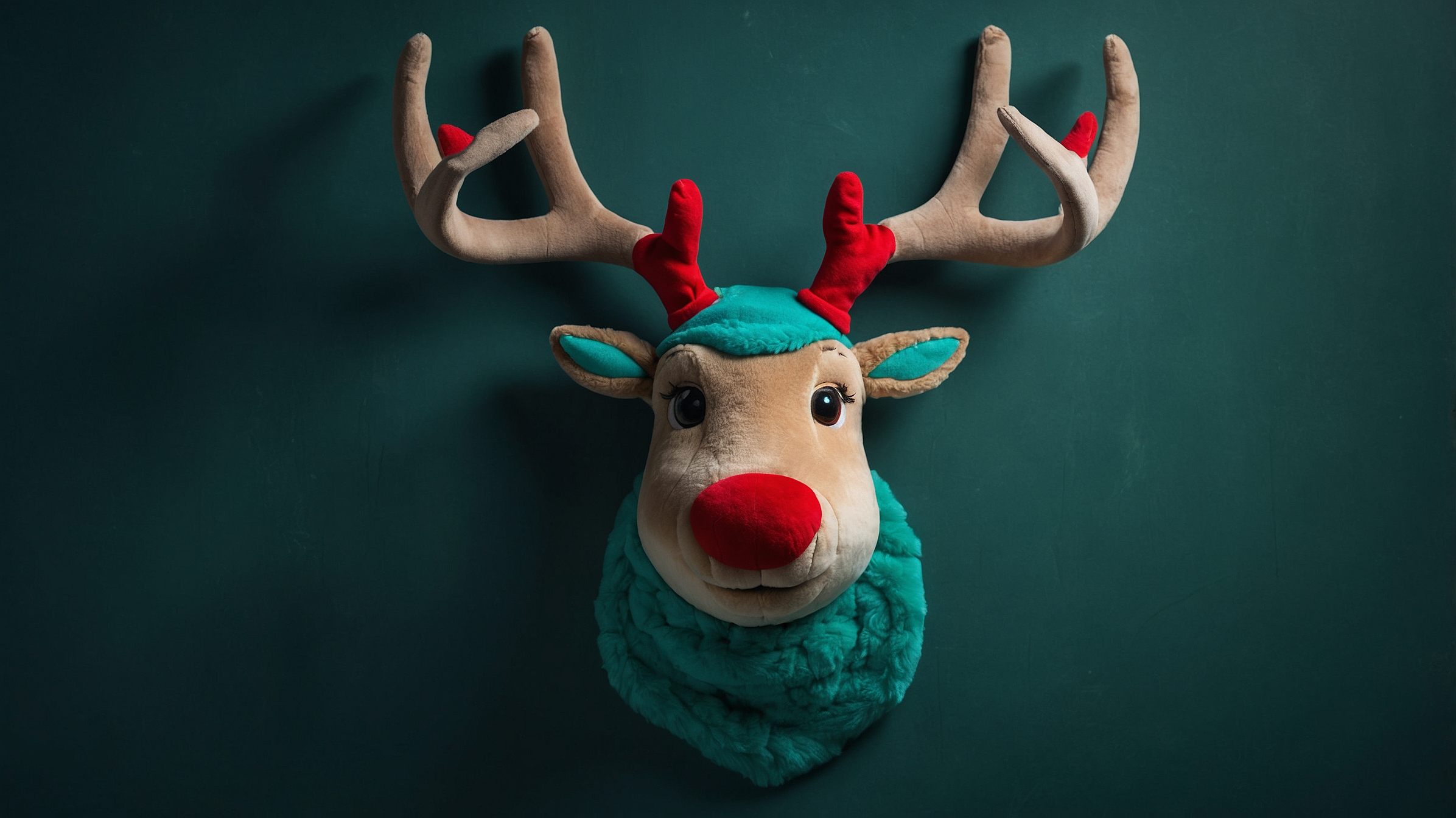 Free AI Image: A plush toy deer head with antlers and a red nose hanging on the dark green wall, with turquoise fur in front of it. The style is colorful, vibrant, and cute, with a minimalist background.