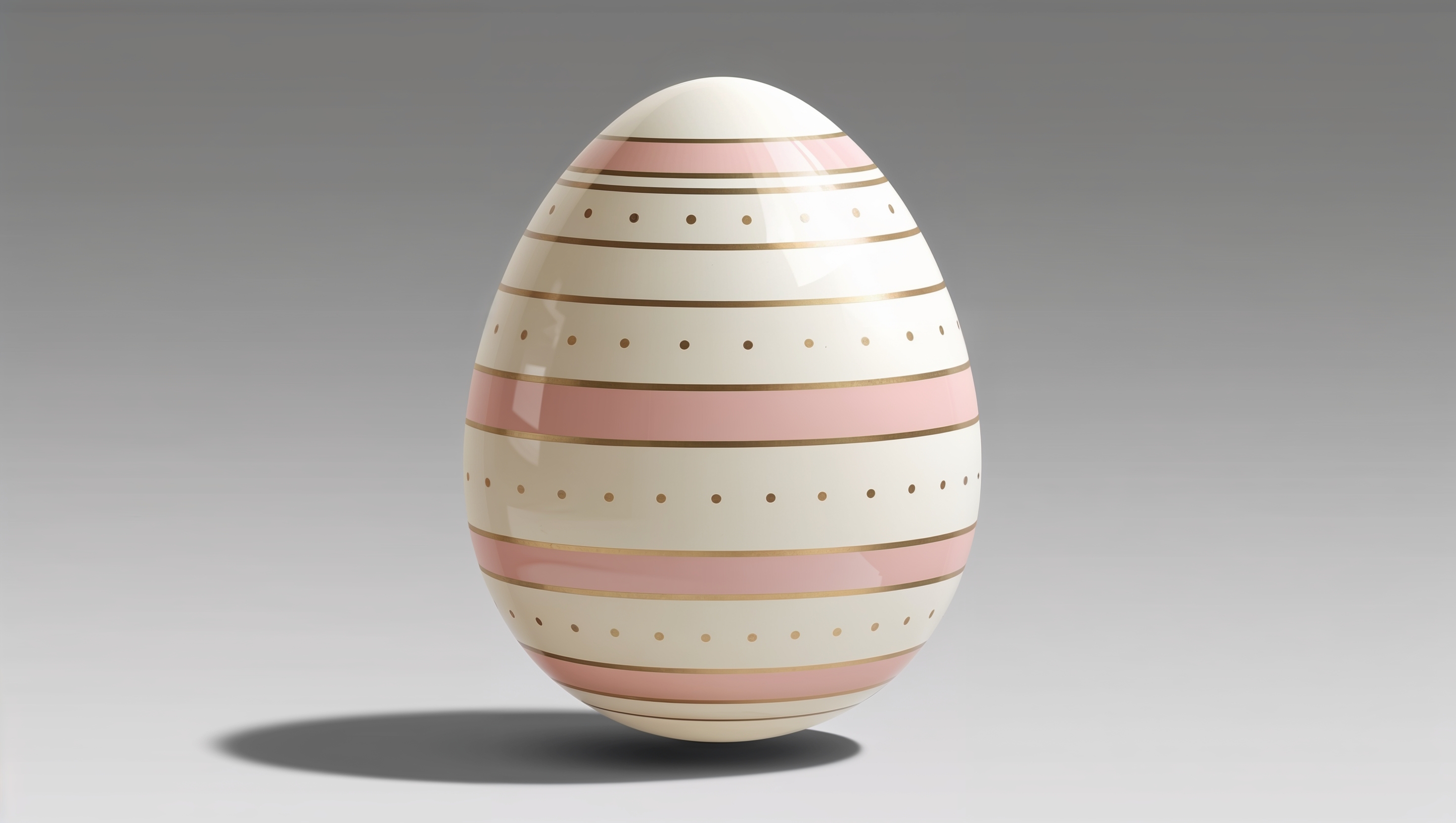A large Easter egg with pink stripes and gold dots stands against a plain gray background. The 3D rendering shows fine details.