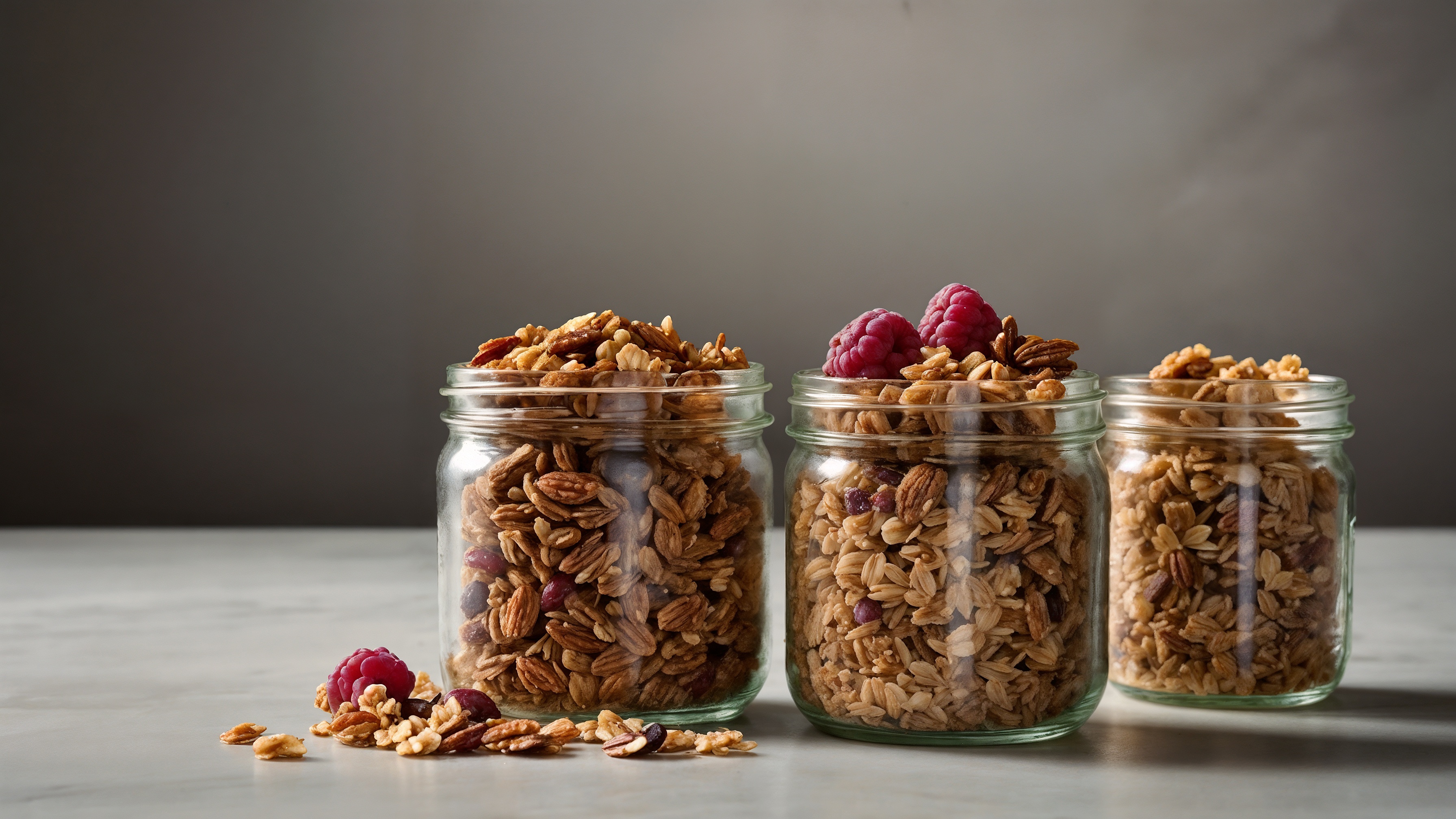 Free AI Image: A photograph of three glass jars filled with granola. The first jar has cranberries and sunflower seeds on top, the second jar is garnished with red berries, and the third jar contains pecans. The background features a plain grey surface, with soft lighting casting gentle shadows across each container, creating an inviting atmosphere for breakfast or snacking.