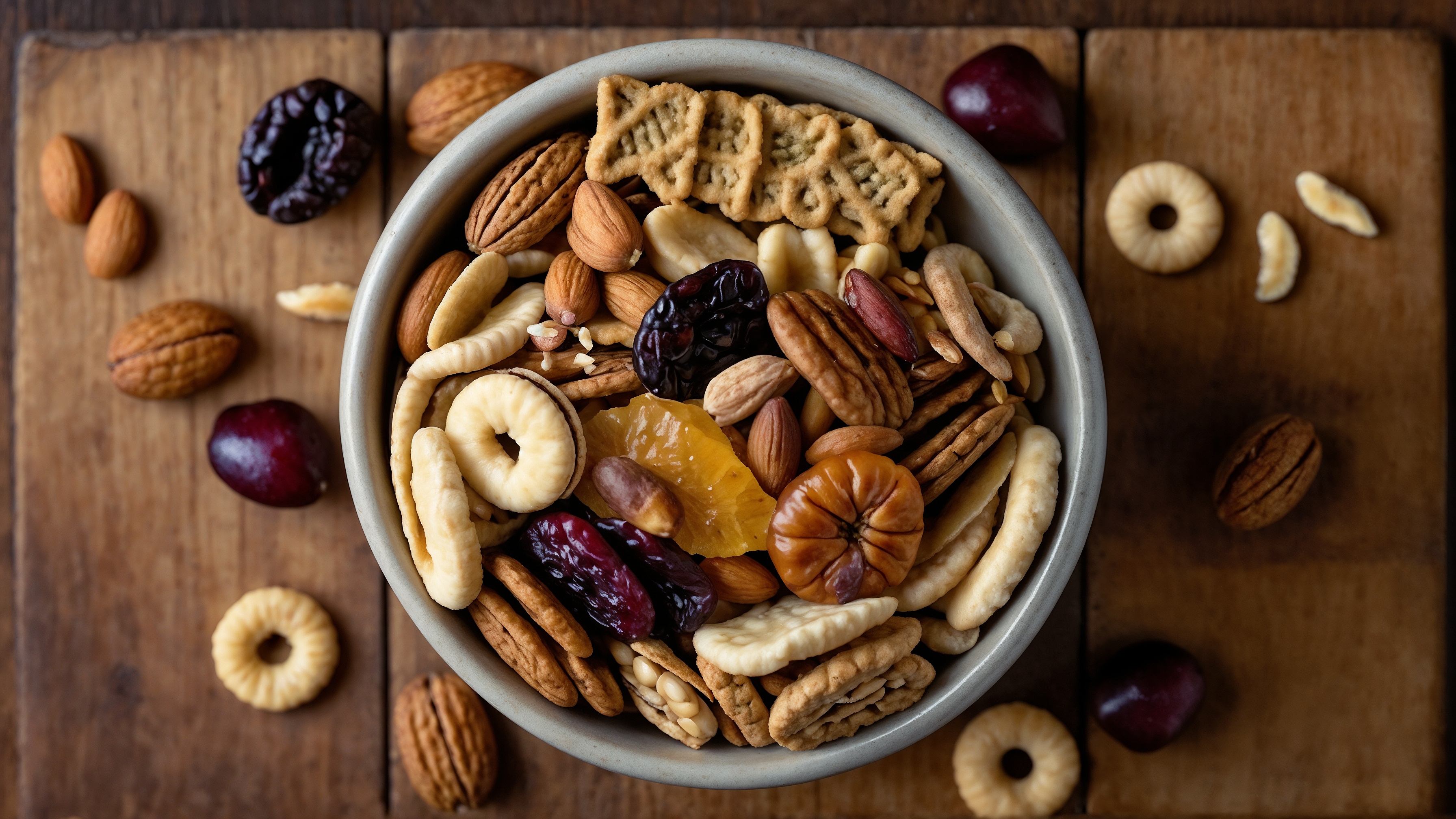 Free AI Image: A bowl of mixed nuts and dried fruits on a wooden background, with a close-up top view. The scene includes various types of foliage, including plums, almonds, prunes, apple rings, croutons, hazelnuts, olives, and rye and wheat crackers – a sophisticated snack, with some elements scattered around the bowl.