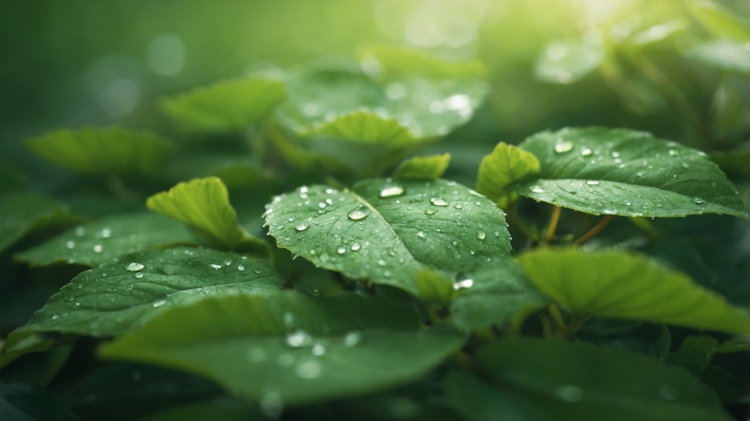 This image captures a close-up view of fresh green leaves covered in water droplets, suggesting a recent rain or morning dew. The background is softly blurred, creating a tranquil and lush natural setting with a vibrant, healthy atmosphere.