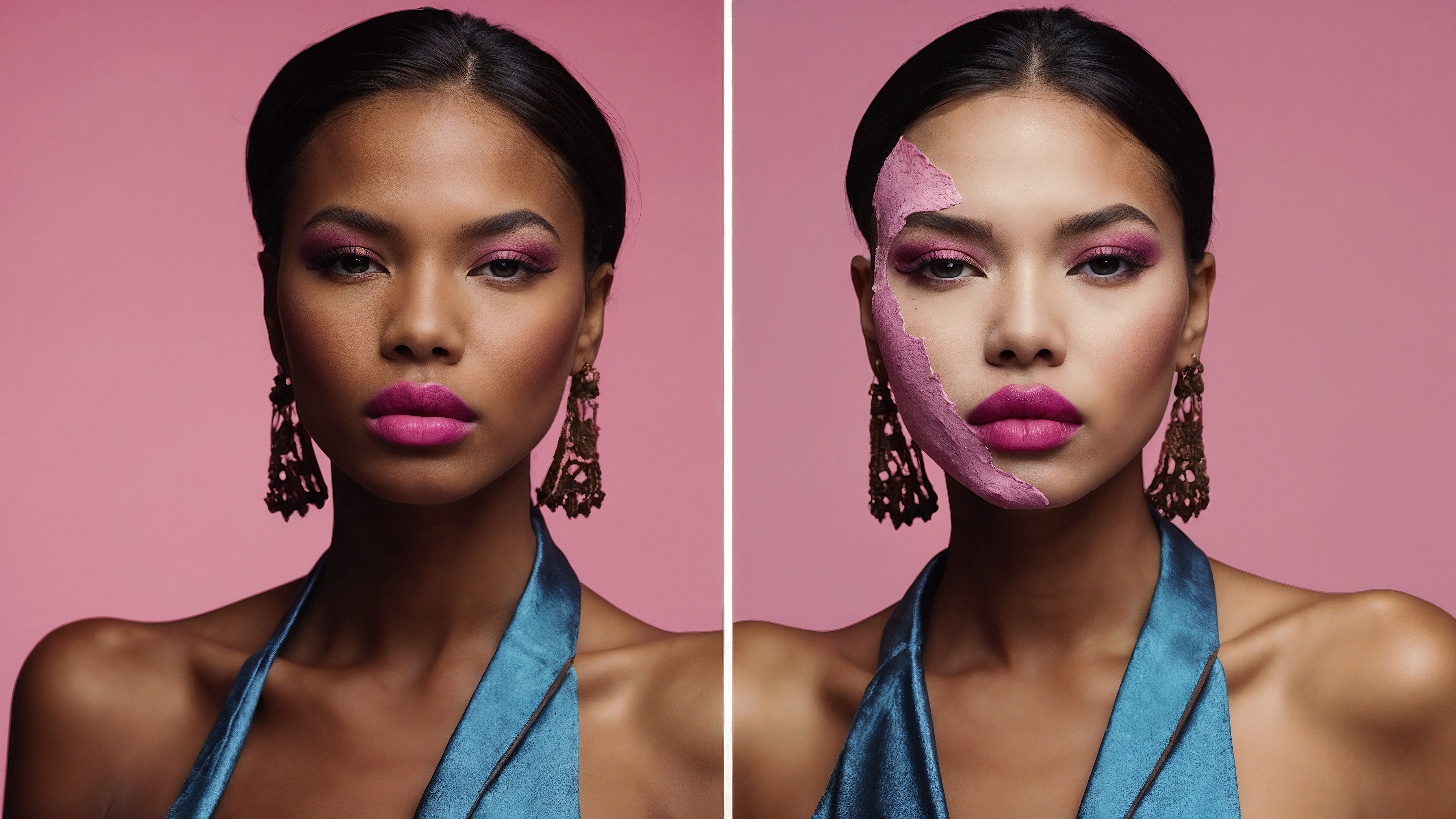 Two stunning Black women pose for a beauty photoshoot. Both wear pink lipstick that enhances their look. Large earrings add bold elegance to their style. On the left, one portrait shows a pink overlay. On the right, the second portrait shows a natural skin tone. The composition contrasts color treatment with natural beauty.