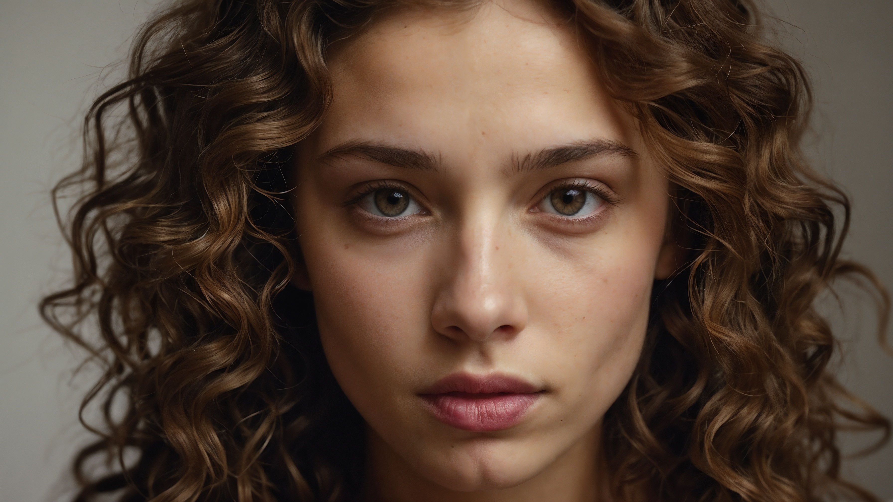 A woman with curly brown hair looks directly at the camera. Piercing eyes draw attention with intensity. Natural makeup highlights her facial features. A neutral background emphasizes her confident expression. She gazes straight ahead with calm assurance.