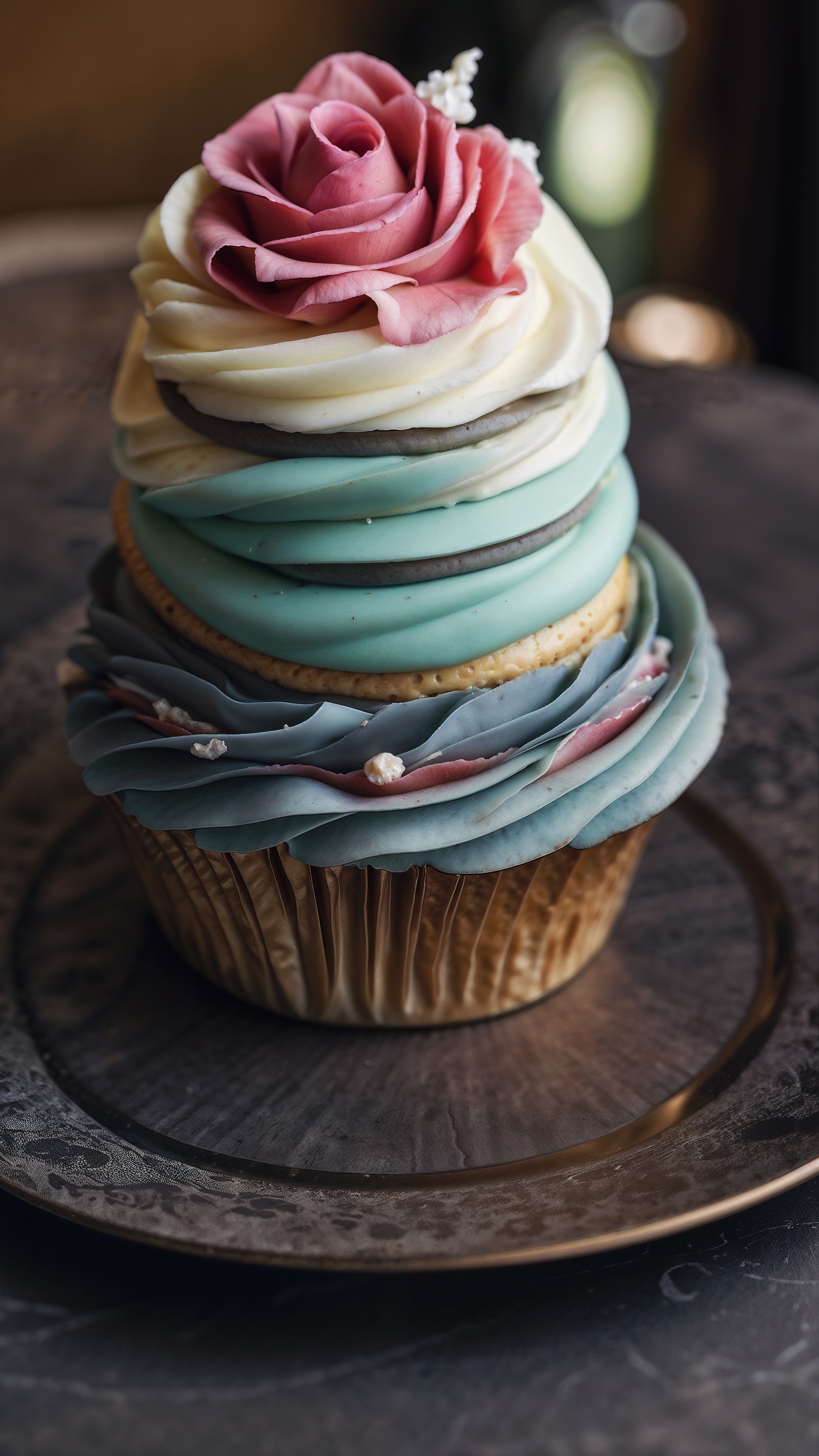 A cupcake features an elegant and colorful design with pastel-colored layers. Delicate icing decorations add intricate details. The cupcake sits atop a table, showcasing its beauty. The realistic photo captures the fine art style of the design. The soft lighting and composition highlight the cupcake’s charm.