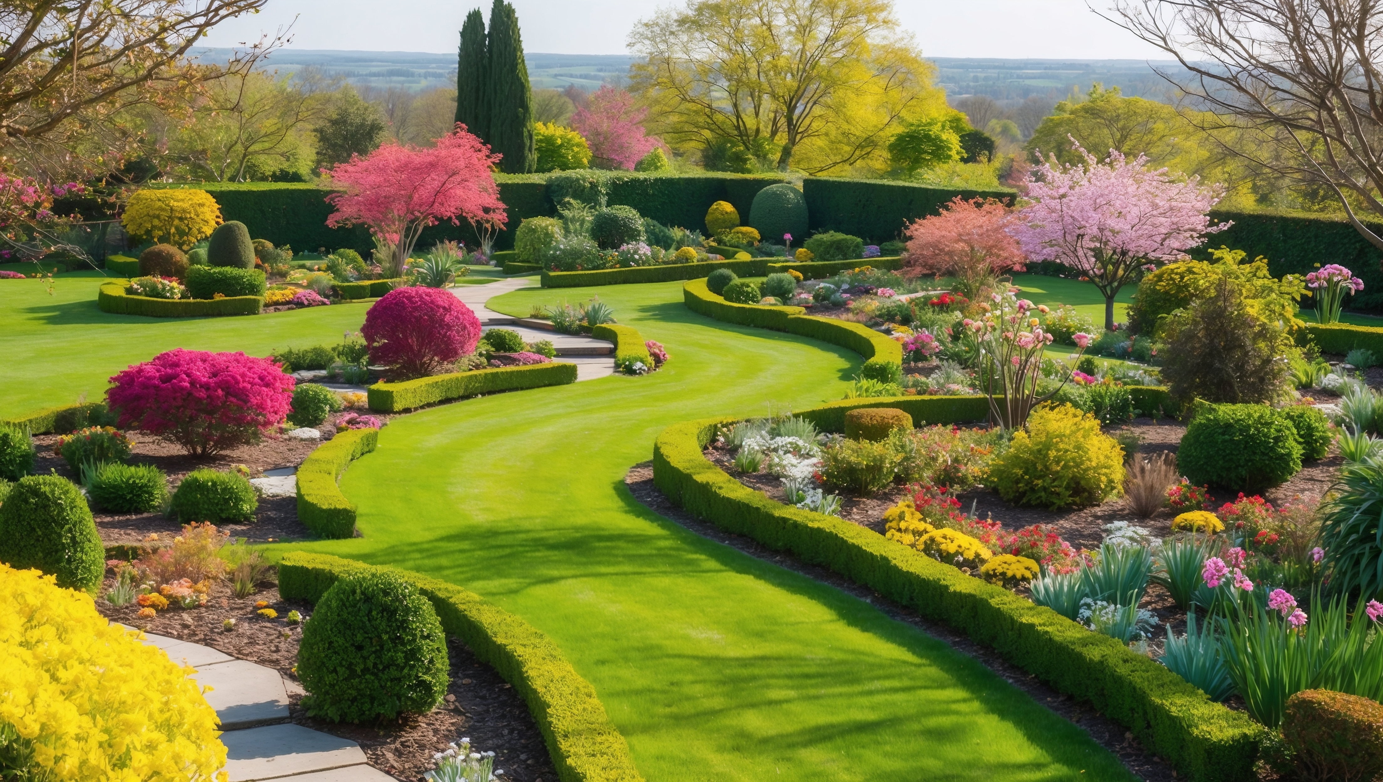 A beautiful ornamental garden with colorful spring flowers, neatly trimmed shrubs, and a manicured lawn in a country-style landscape. Winding paths and topiary hedges lead to a grand home, creating a picturesque scene.