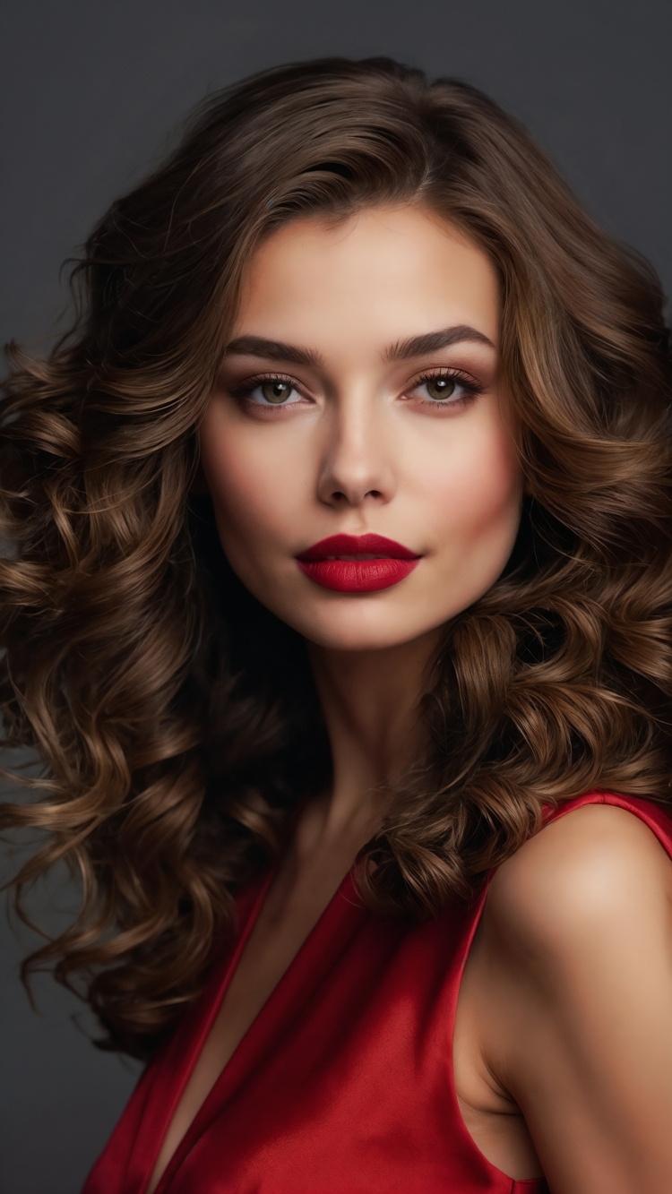A close-up portrait of a glamorous young woman with voluminous, wavy chestnut hair cascading over her shoulders. She wears a silky red dress that complements her flawless skin and striking red lipstick. The expression on her face is confident and poised, with soft makeup highlighting her eyes and cheekbones against a solid dark gray background.