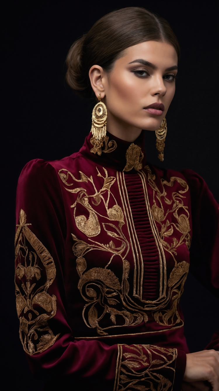 A regal portrait of a woman with a confident expression, dressed in an intricately embroidered deep burgundy velvet gown. The rich golden floral embroidery contrasts strikingly with the plush fabric, highlighting the sophisticated detailing on the bodice, sleeves, and cuffs. Her hair is pulled back into a sleek, elegant bun, complementing the stately look, while large ornate gold earrings add a touch of opulence. The dark, plain background enhances the subject’s features and luxurious attire, creating a dramatic and refined atmosphere.