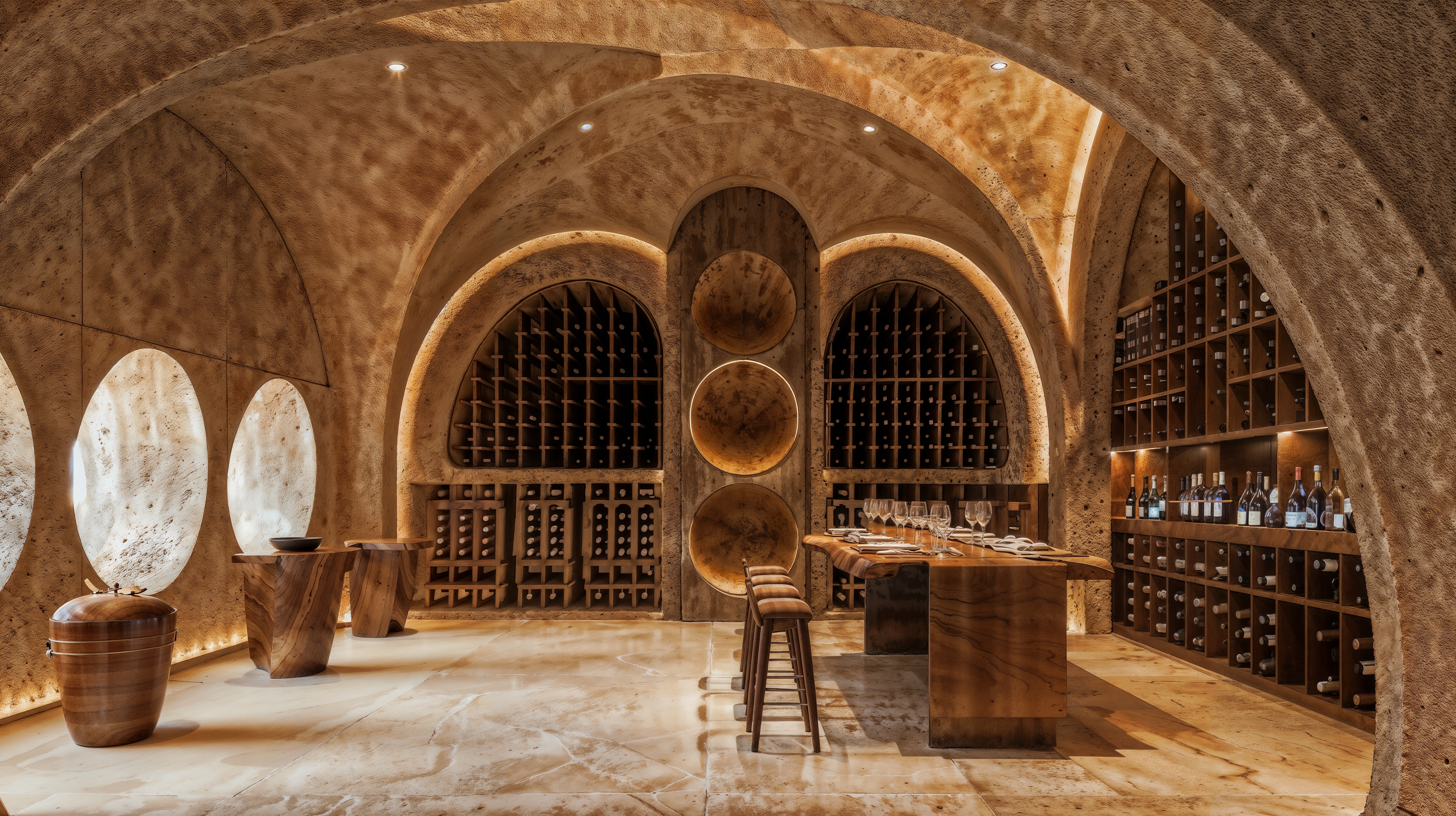 Elegant Wine Cellar with Arched Design and Warm Lighting