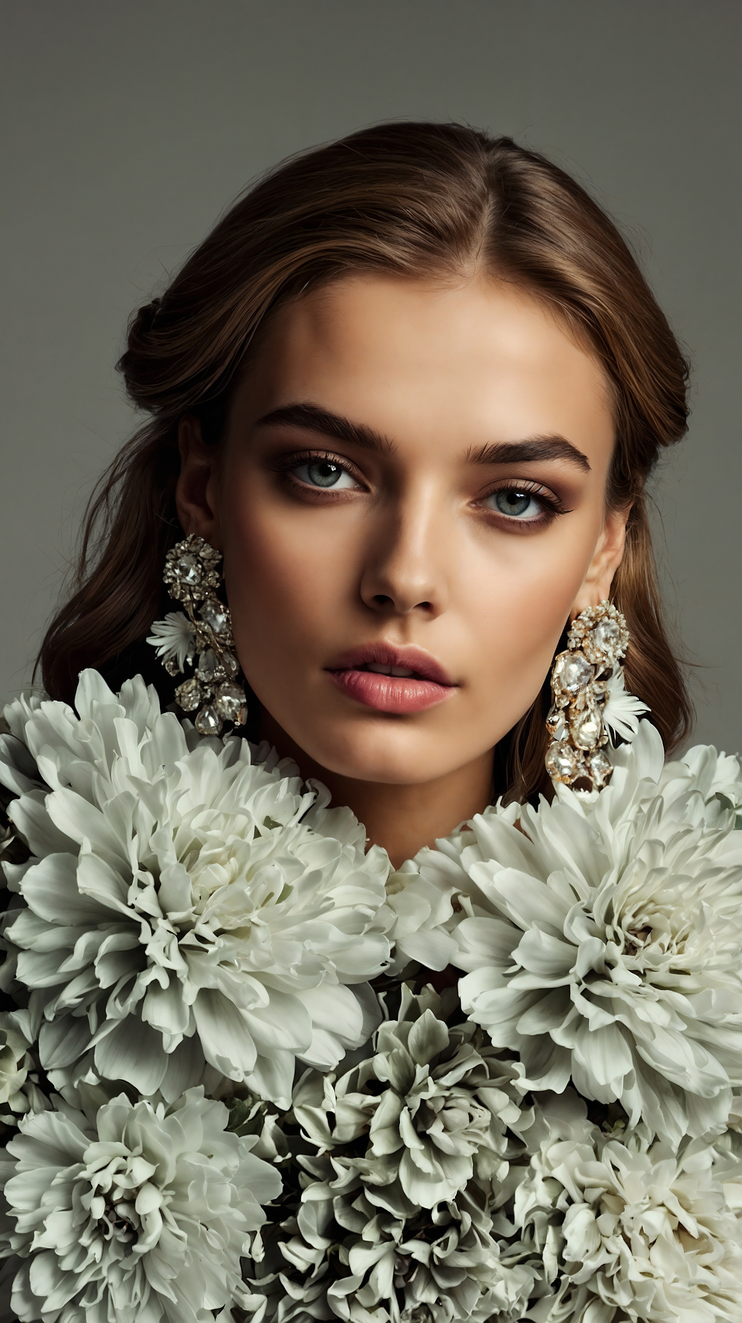 A beautiful woman with long hair wears elegant earrings and a white dress crafted from large flowers.Her makeup is exquisite, highlighting her delicate facial features.The gray background enhances the floral theme and elegant aesthetic.