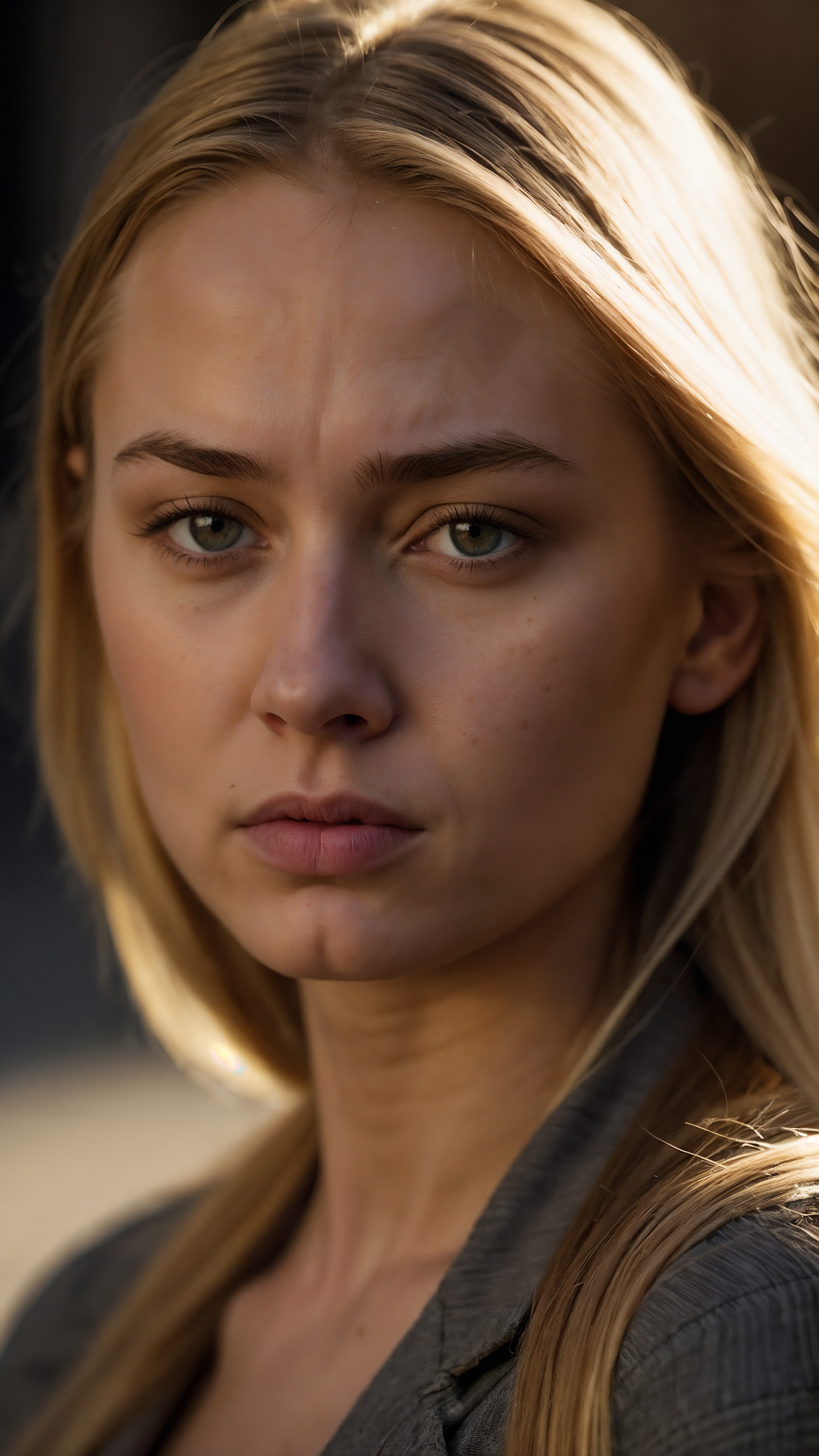 A blonde woman in her late thirties stands outdoors in daylight. She wears a grey blazer and straight shoulder-length hair. Sunlight illuminates half of her face while shadows cover the rest. She looks toward the camera with a neutral expression. Her eyes glance slightly away, adding emotion. A building wall creates a simple urban backdrop.