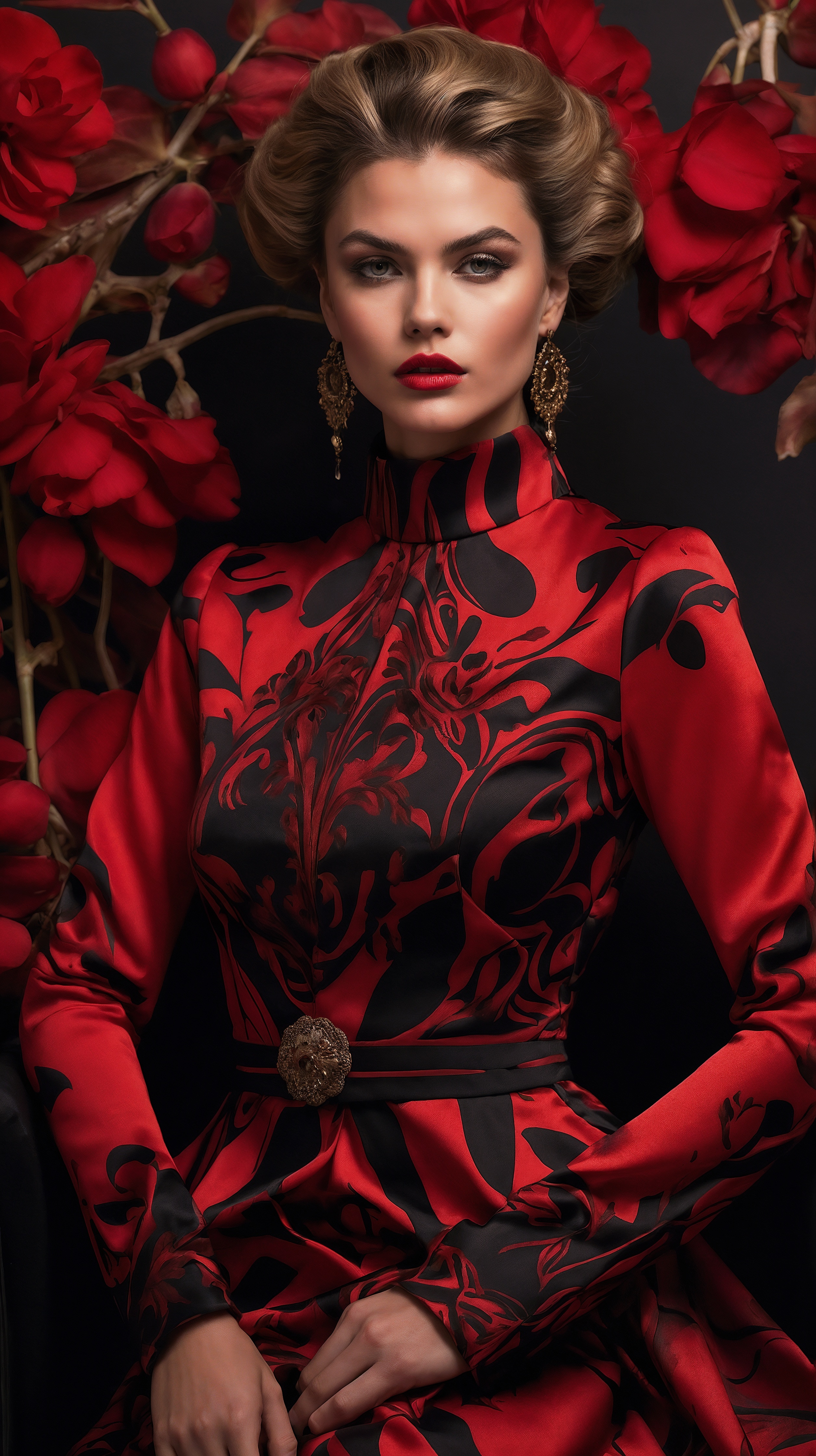 A beautiful woman wears a red and black patterned dress with an elegant hairstyle and bold red lips in a full-body portrait. Red roses fill the background, enhancing the luxurious mood of the fashion scene. Cinematic lighting and haute couture styling create a hyper-detailed, photorealistic image fit for a magazine cover.