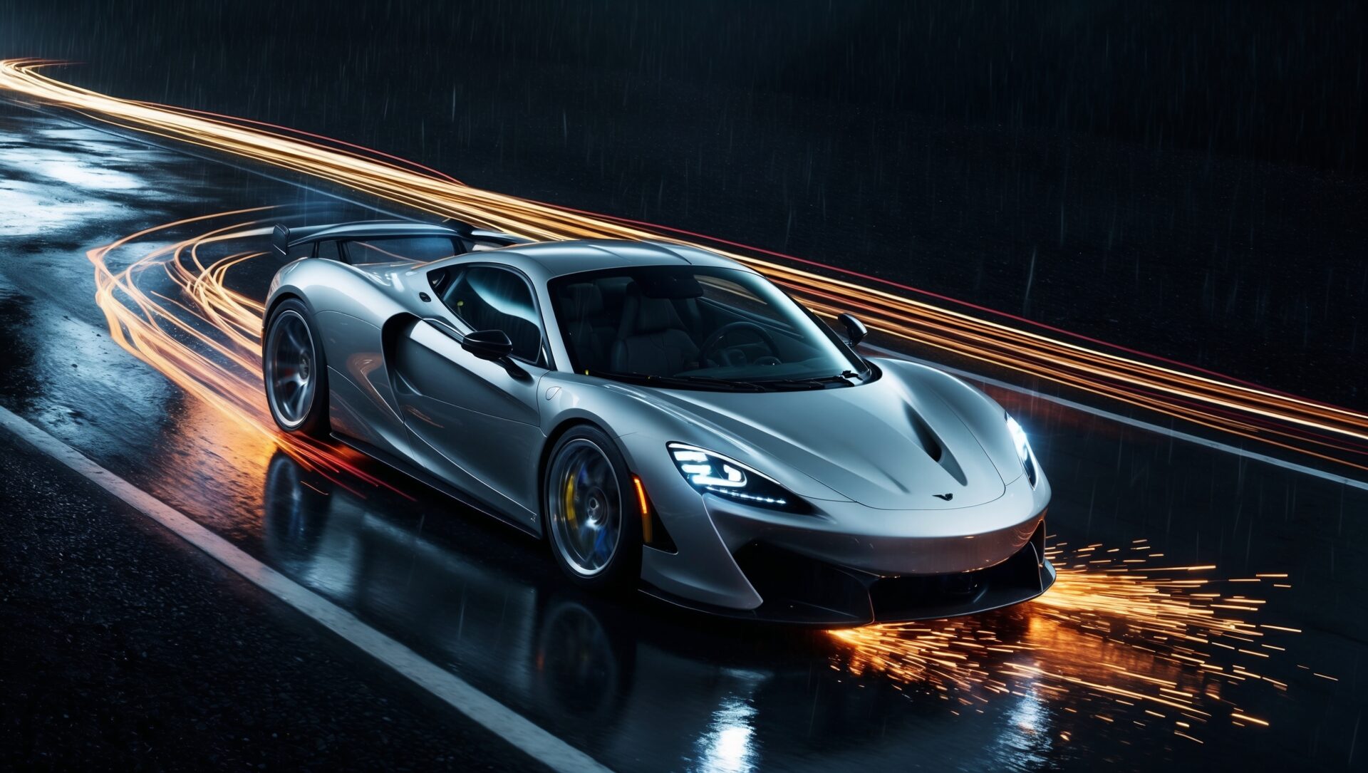 A silver car speeds on a wet road at night, with sparks flying around it. The panning shot captures its motion against a black background.