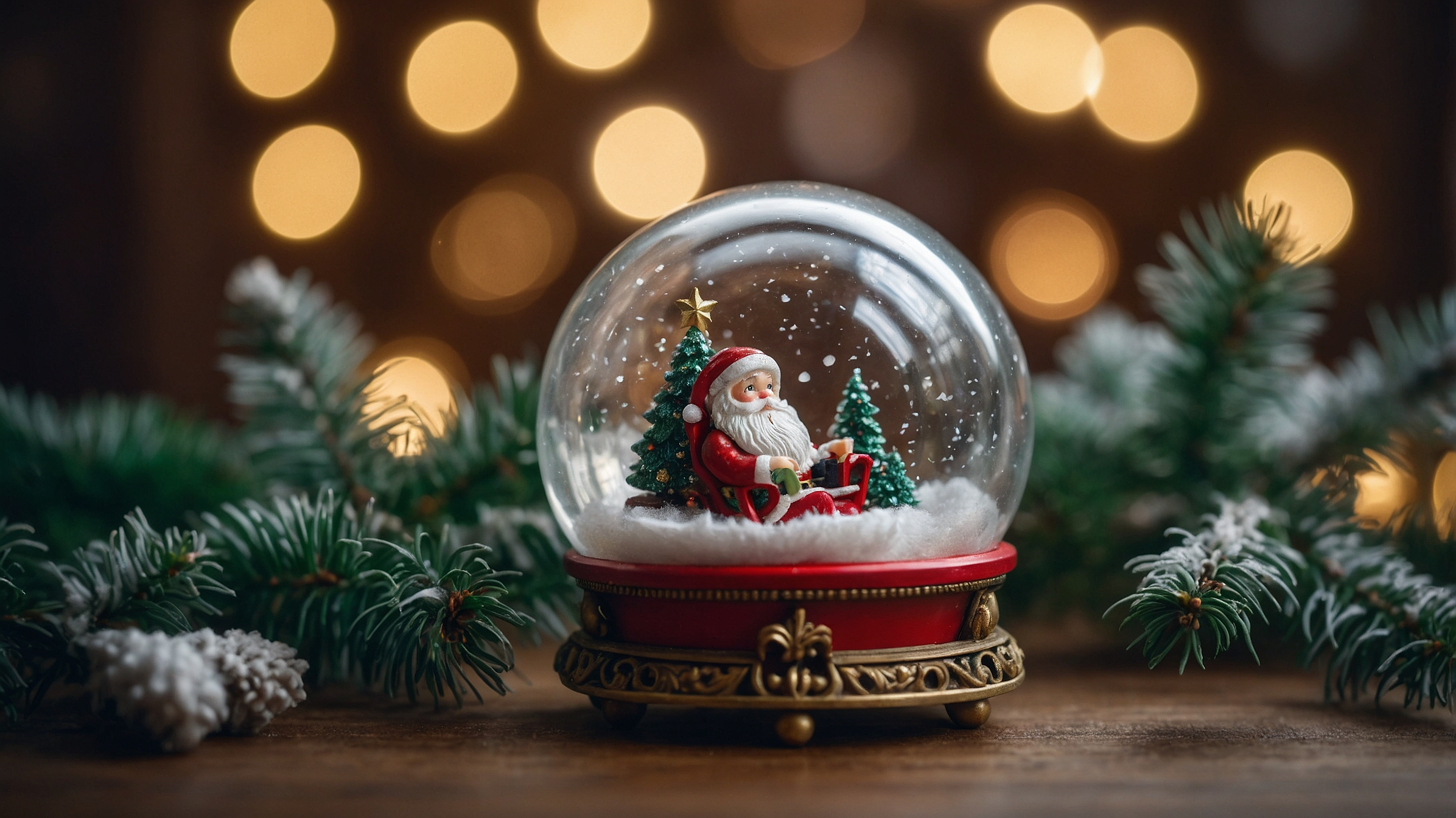 Free AI Image: A cute Christmas snow globe with Santa Claus sitting in it, surrounded by pine branches and bokeh lights in the background. The scene is set against a wooden table surface, creating an atmosphere of joyous celebration during the holiday season.