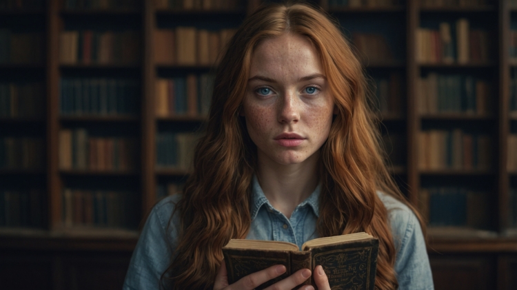 A young woman with long, wavy auburn hair stands centered in an old, dimly lit library, holding an ancient, leather-bound book open in front of her. Her pale skin is dotted with freckles, and her intense blue eyes gaze directly forward, creating a moment of quiet introspection. The background is filled with towering wooden bookshelves overflowing with books, their details softly blurred to keep the focus on her expressive face.