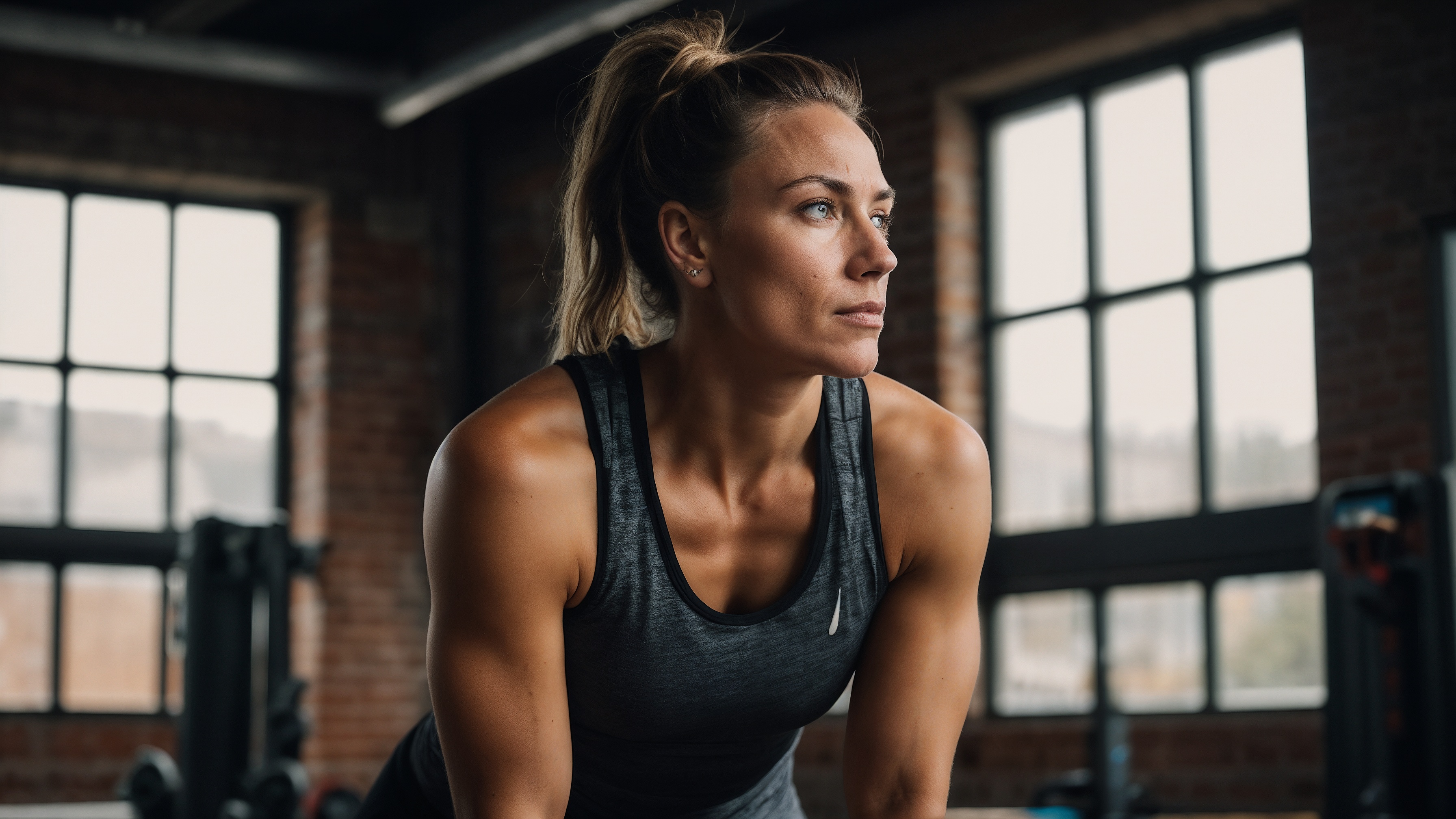 Free AI Image: A fitness influencer woman working out in gym, side view, focus on her upper body and face, wearing dark grey tank top, natural light from large windows.