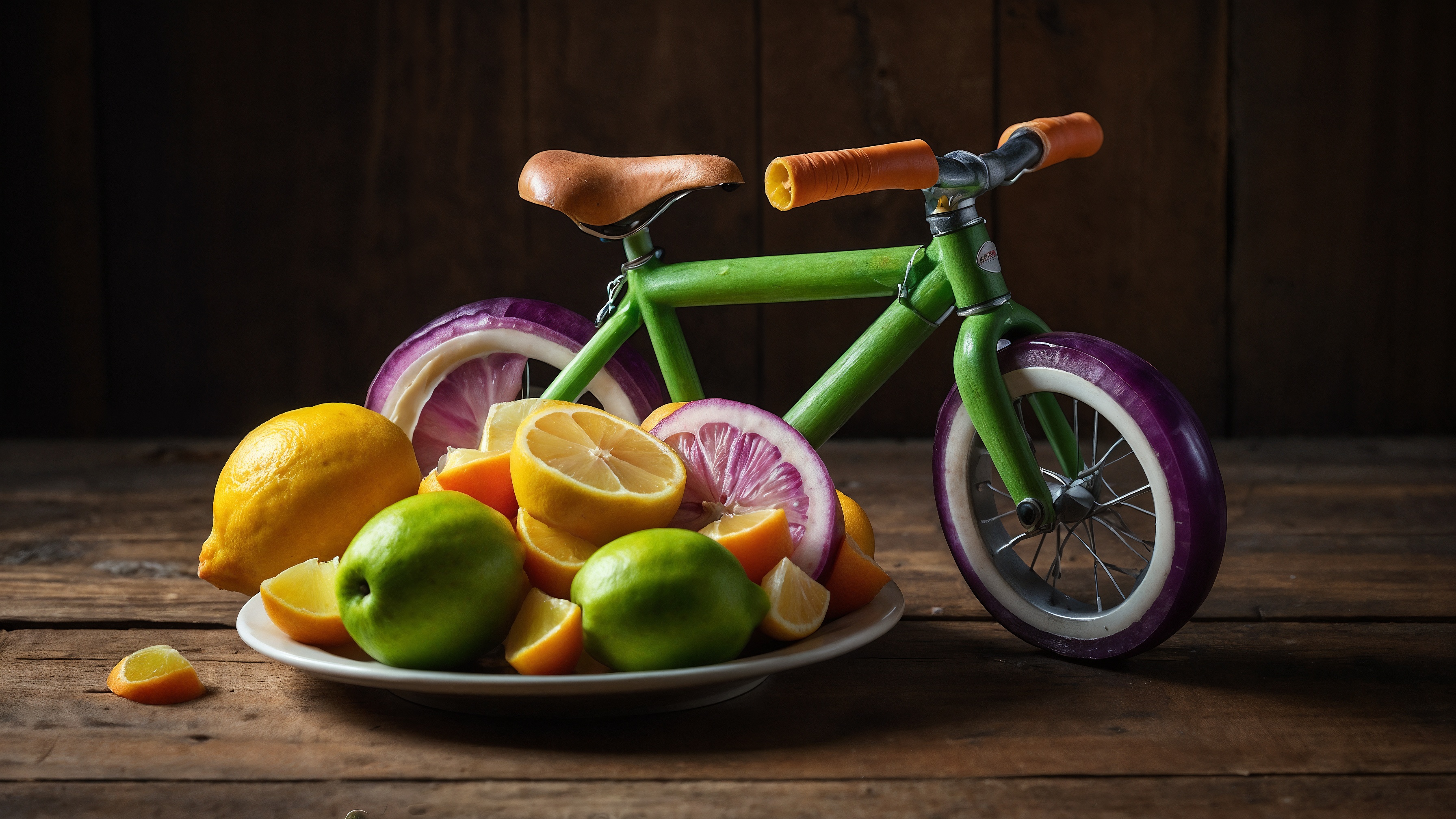 Free AI Image: A green children’s bicycle with red handlebars and purple wheels, next to it is a plate of fruit on the table, with many lemons, oranges, and limes, in the style of food photography. The background is wooden, with dark tones and soft lighting, minimalist, cinematic, high-resolution, high-detail, and professional color grading.