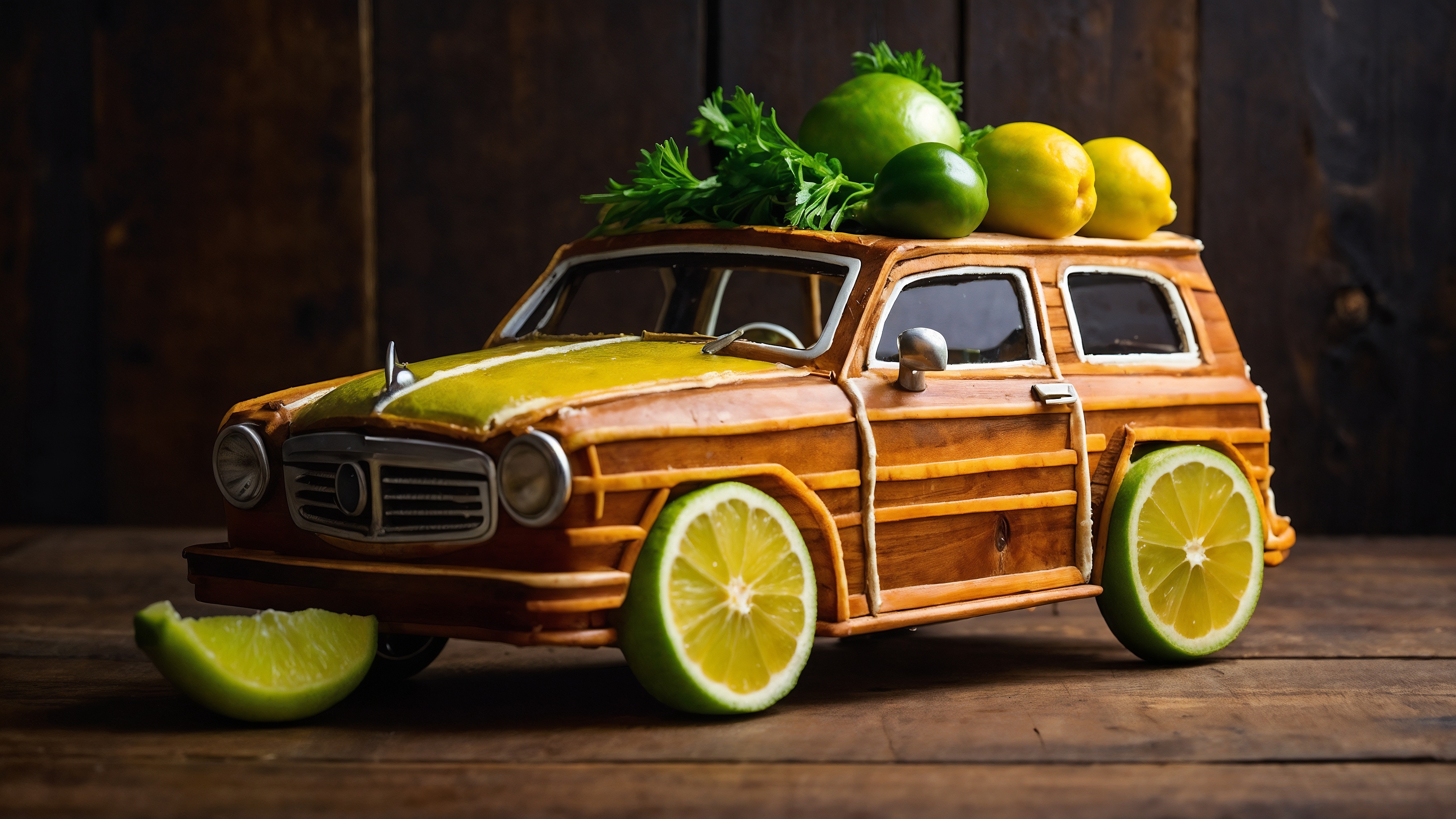 Free AI Image: Wooden car made of limes and lemons, food art, creative photography, high-resolution photography.