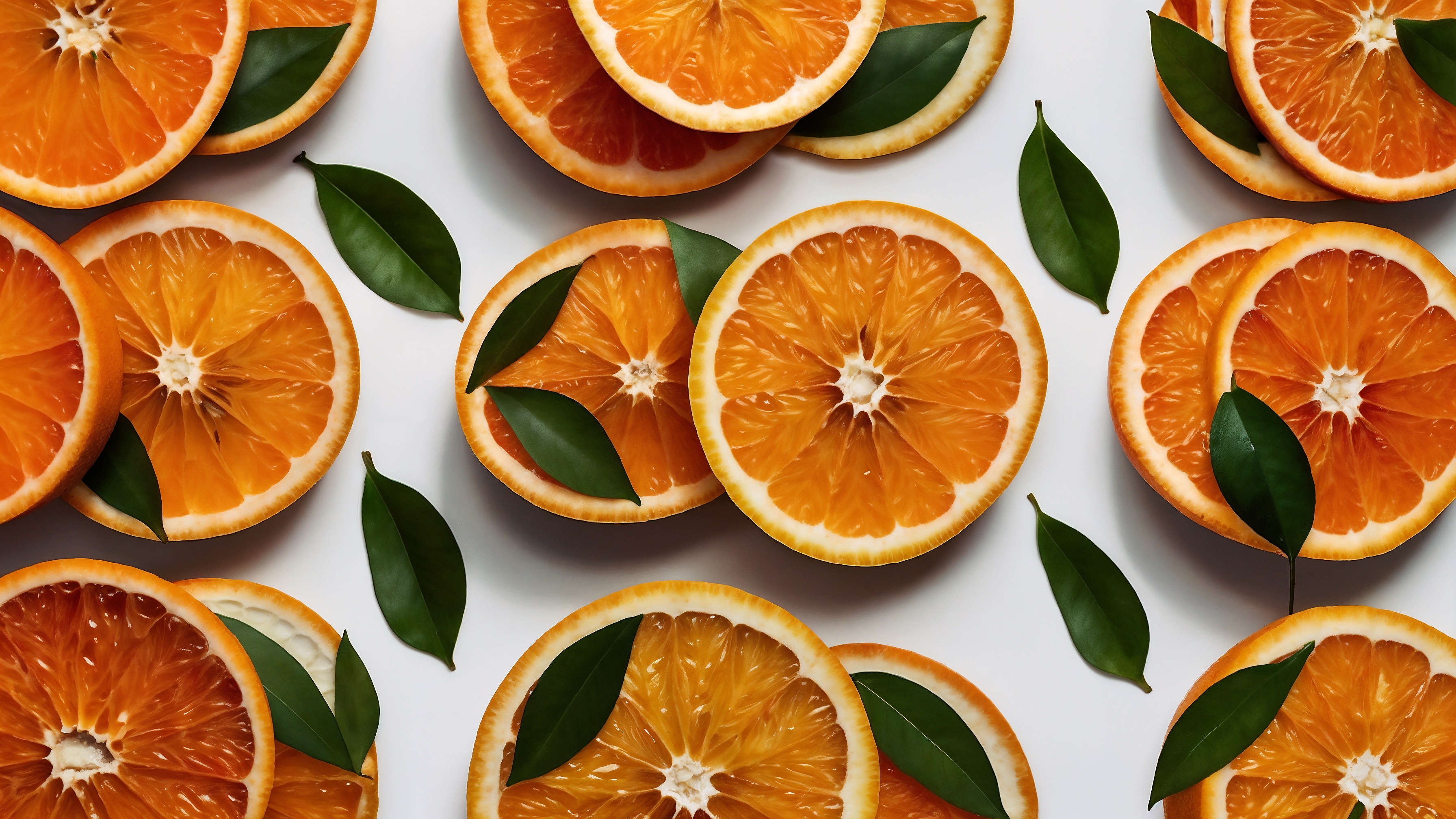 Free AI Image: Slices of orange fruit with leaves on a white background, top view, creating a pattern. Orange fruit slices on a table. Many oranges cut into thin slices. Flat lay. Top-down view.