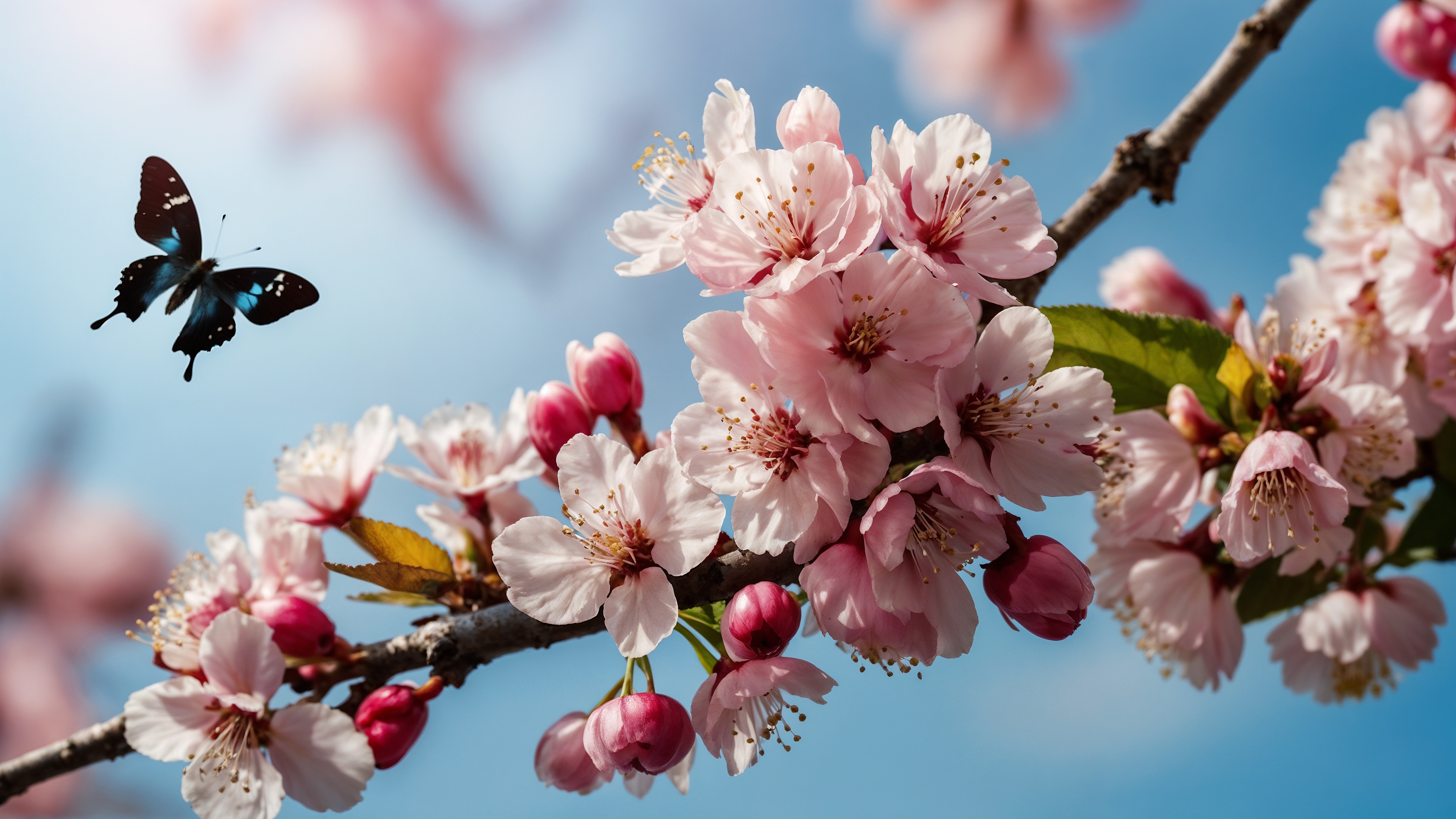Free AI Image: A butterfly fluttering over pink cherry blossoms, high-definition photography.