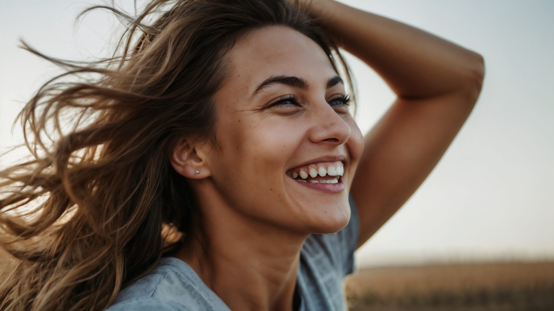 Happy woman lifestyle portrait photo designed for wellness branding, lifestyle projects, and modern visual storytelling. This realistic outdoor portrait captures natural light, movement, and a joyful expression, creating an authentic and energetic atmosphere perfect for positive and inspiring content.