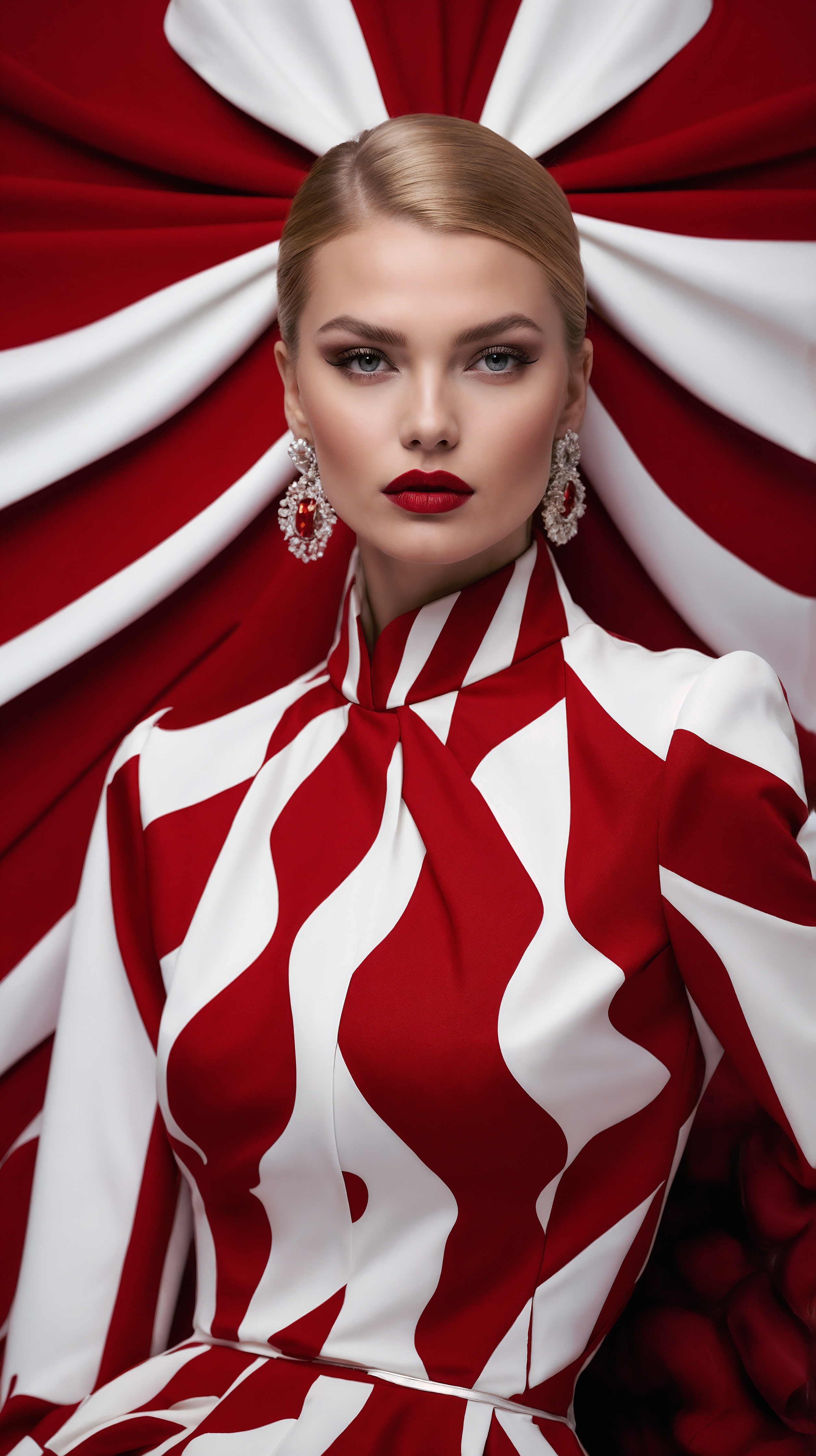 A beautiful woman in a red and white dress, wearing large earrings, poses against a striped ribbon backdrop. The luxurious fashion style highlights her makeup, red lips, and symmetrical composition, with clear focus on her face.