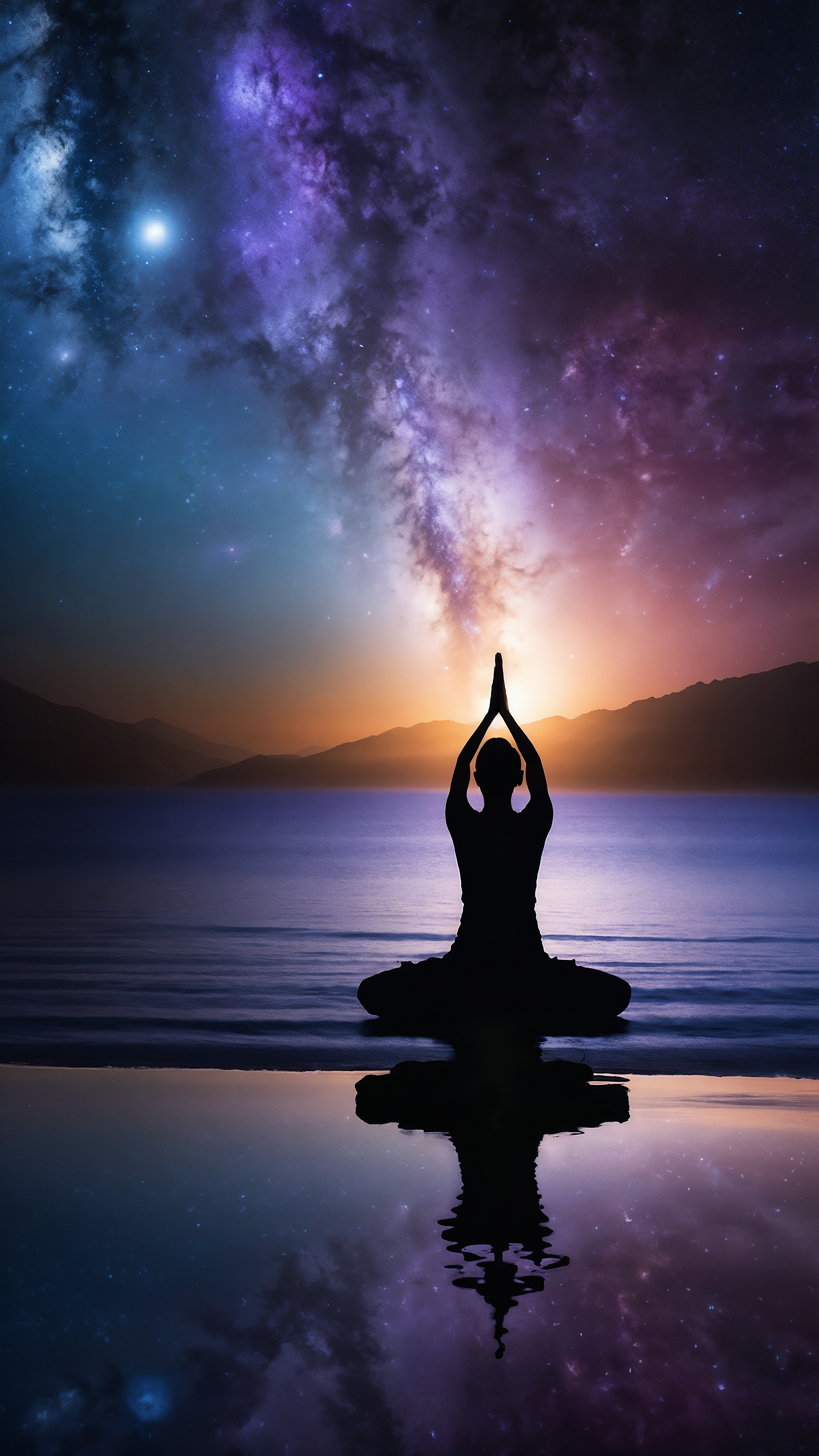 A silhouette of a woman in the lotus position meditates under a starry sky and the Milky Way. Reflections in a tranquil lake enhance the serene ambiance. Yoga symbols and digital art style create a spiritual, peaceful scene.