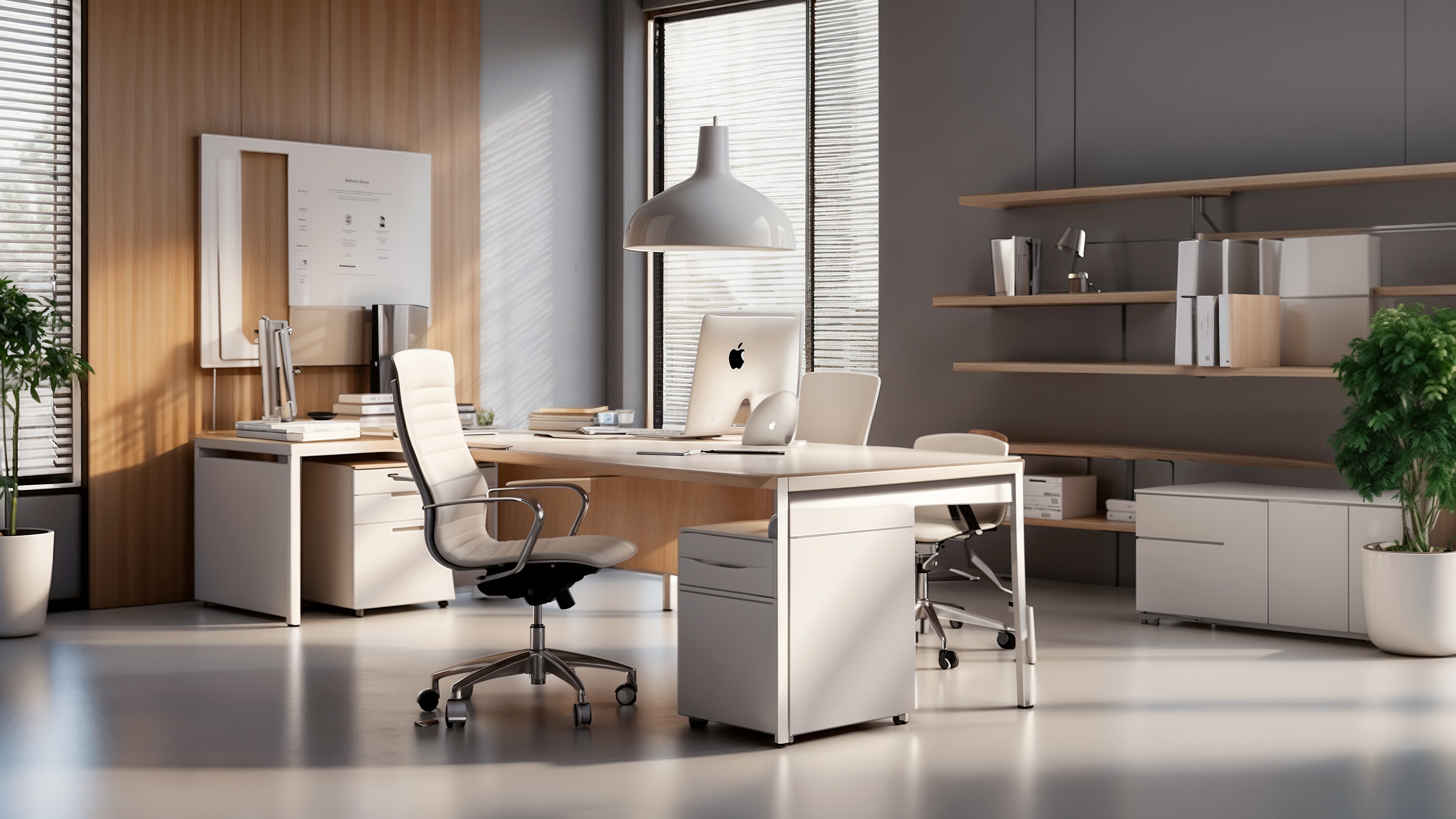 A modern office features a white desk, computer, and chair, with wood wall panels and large windows for natural light.