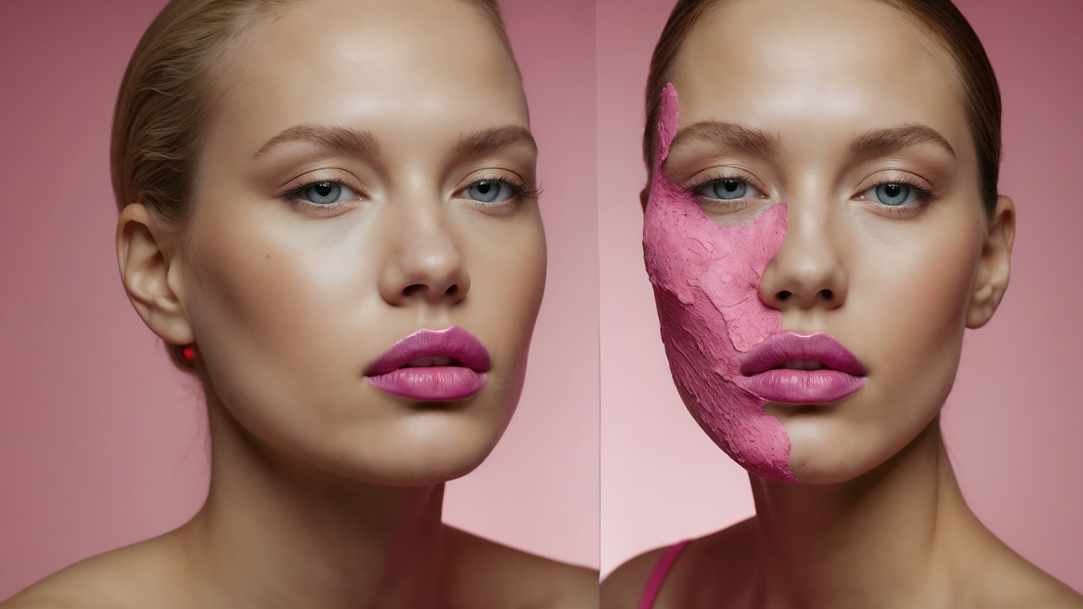 A beauty model poses with pink lipstick. Pink paint and clay mask cover the right side of her face. One cheek shows an artistic touch that highlights a soft shadow. The pastel pink background creates a gentle atmosphere. The artwork features two photos, each showing one half of her head.