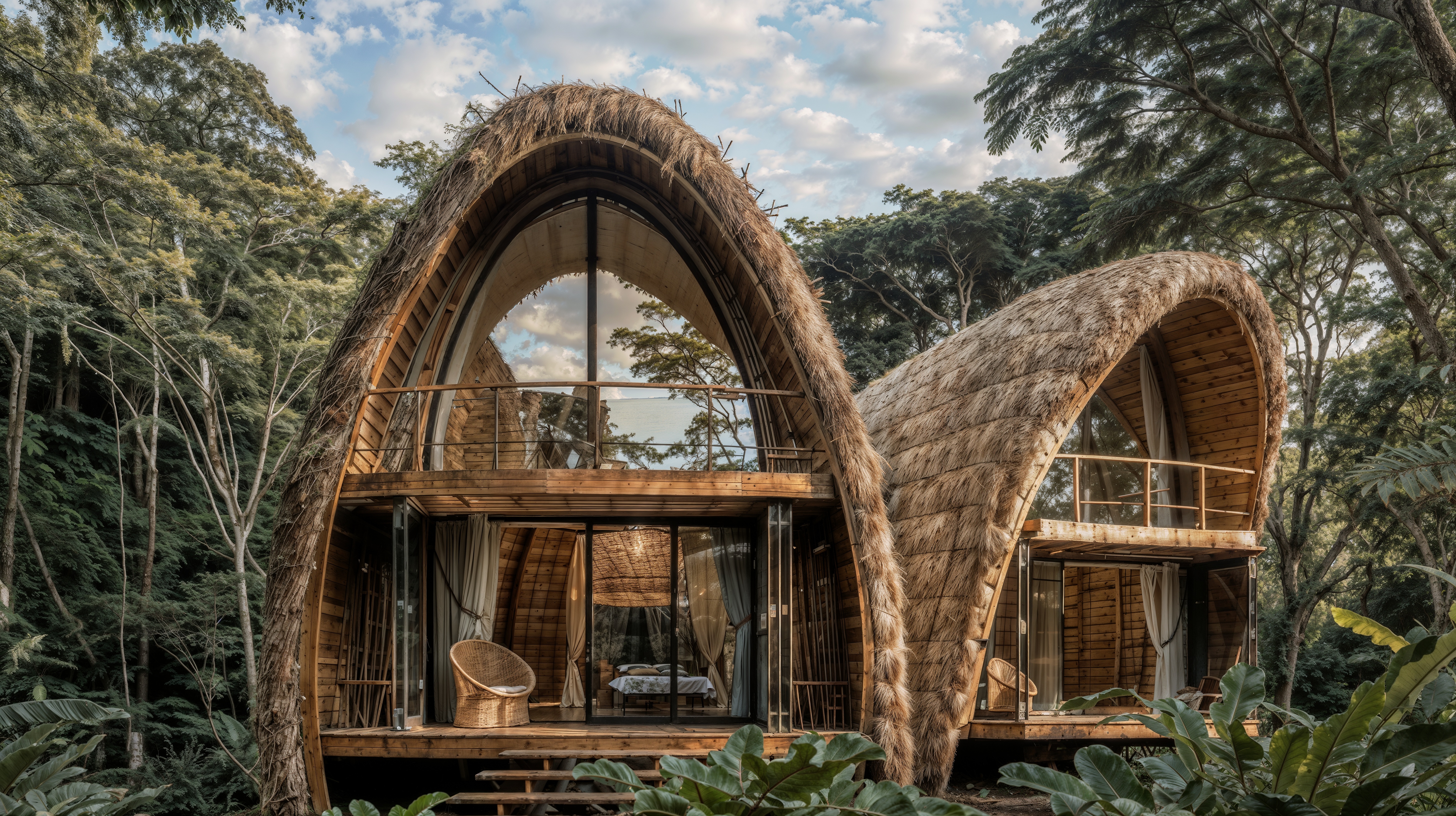 Free AI Image: A bamboo structure with an arched shape and large windows in the jungle, featuring two modern luxury hotel rooms stacked on top of each other and connected to one another, covered with a natural thatch roof made from straw or palm leaves. In front, there is a wooden balcony area with comfortable chairs for relaxation, surrounded by lush green trees and nature. The overall atmosphere should be serene, tranquil, eco-friendly, sustainable, elegant, modern, and minimalistic.