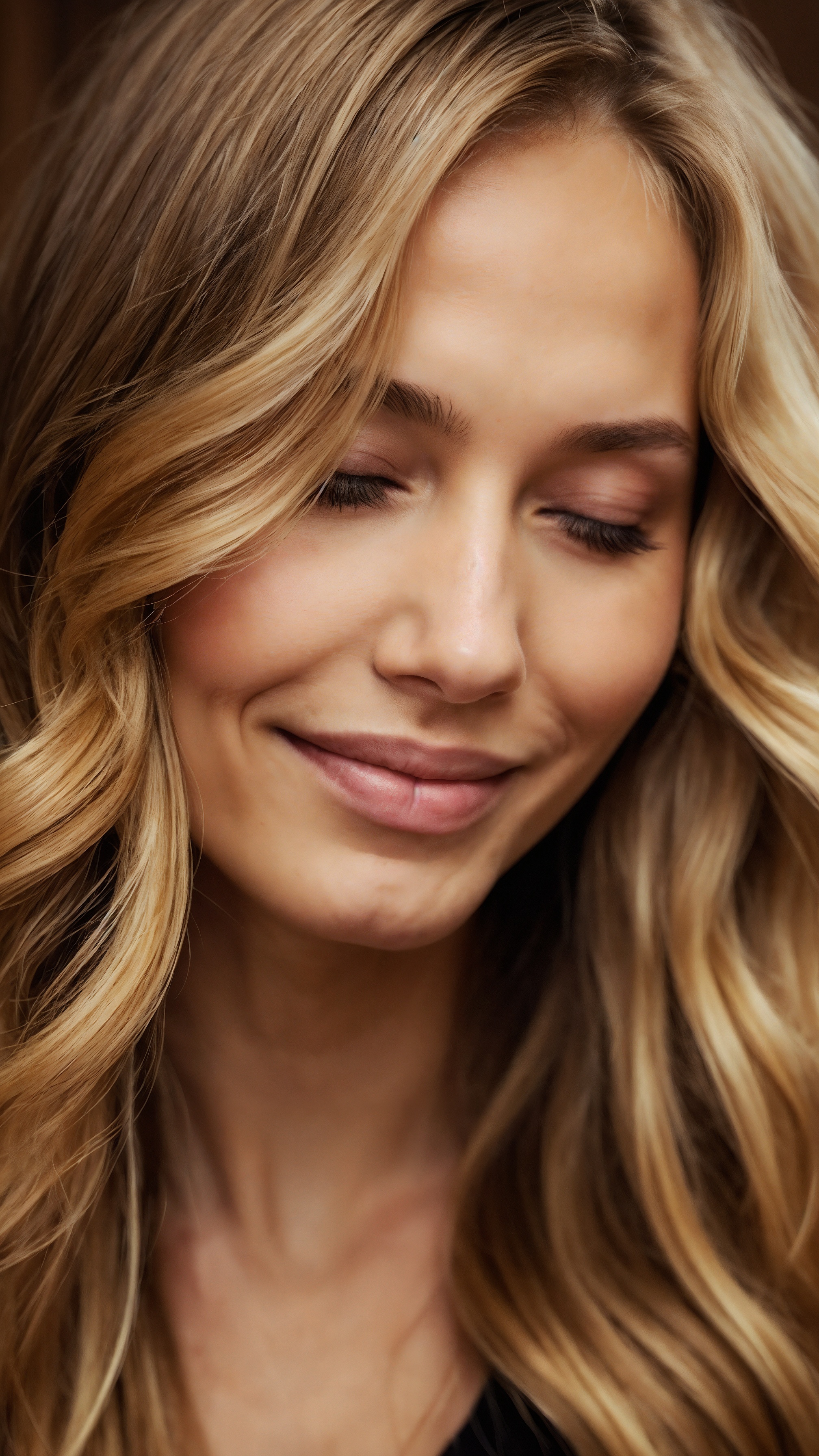 A close-up portrait of a blonde woman with soft wavy hair, smiling gently as she looks down with her eyes closed. Her long, flowing locks cascade over one side of her face, enhancing her natural beauty. The warm, soft lighting highlights her delicate features, creating a serene and graceful atmosphere. Her expression conveys quiet confidence and charm, making the image versatile for advertising, fashion, or lifestyle photography.