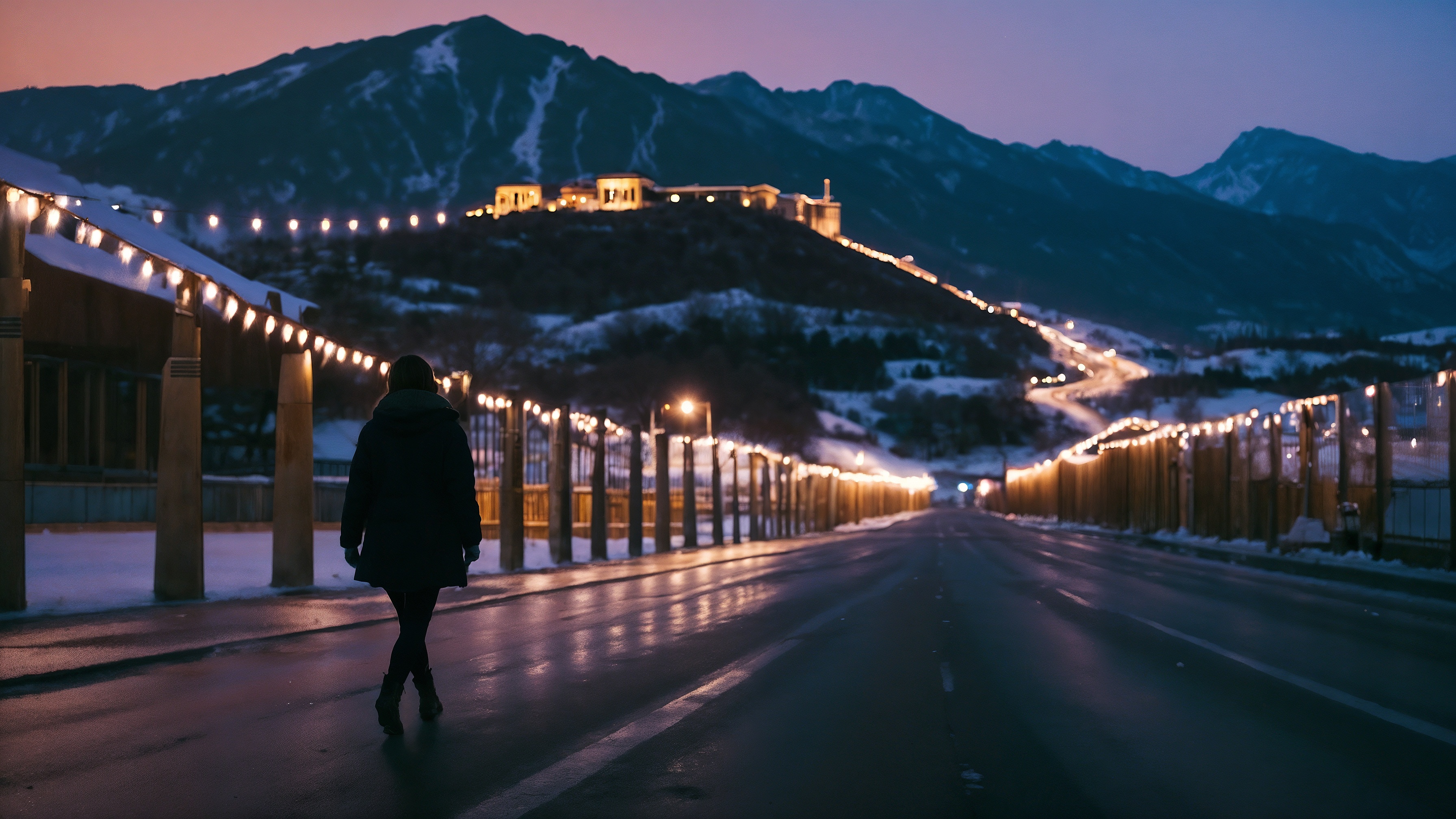 A woman walks alone on the side of a dimly lit highway at night beside a long illuminated wall. Snow-covered mountains rise behind the wall, with an old castle glowing softly in front of one peak.