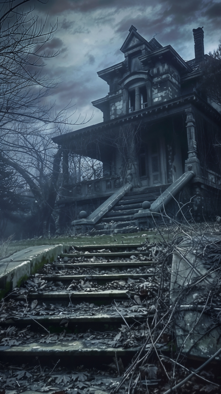 A haunting, old Victorian-style house stands ominously at the top of a flight of decayed stone steps. The scene is filled with a chilling atmosphere of neglect and abandonment, as dead leaves and twisted, barren branches dominate the foreground and surround the house. The sky is overcast with dark, heavy clouds, adding to the eerie and foreboding mood of the setting.