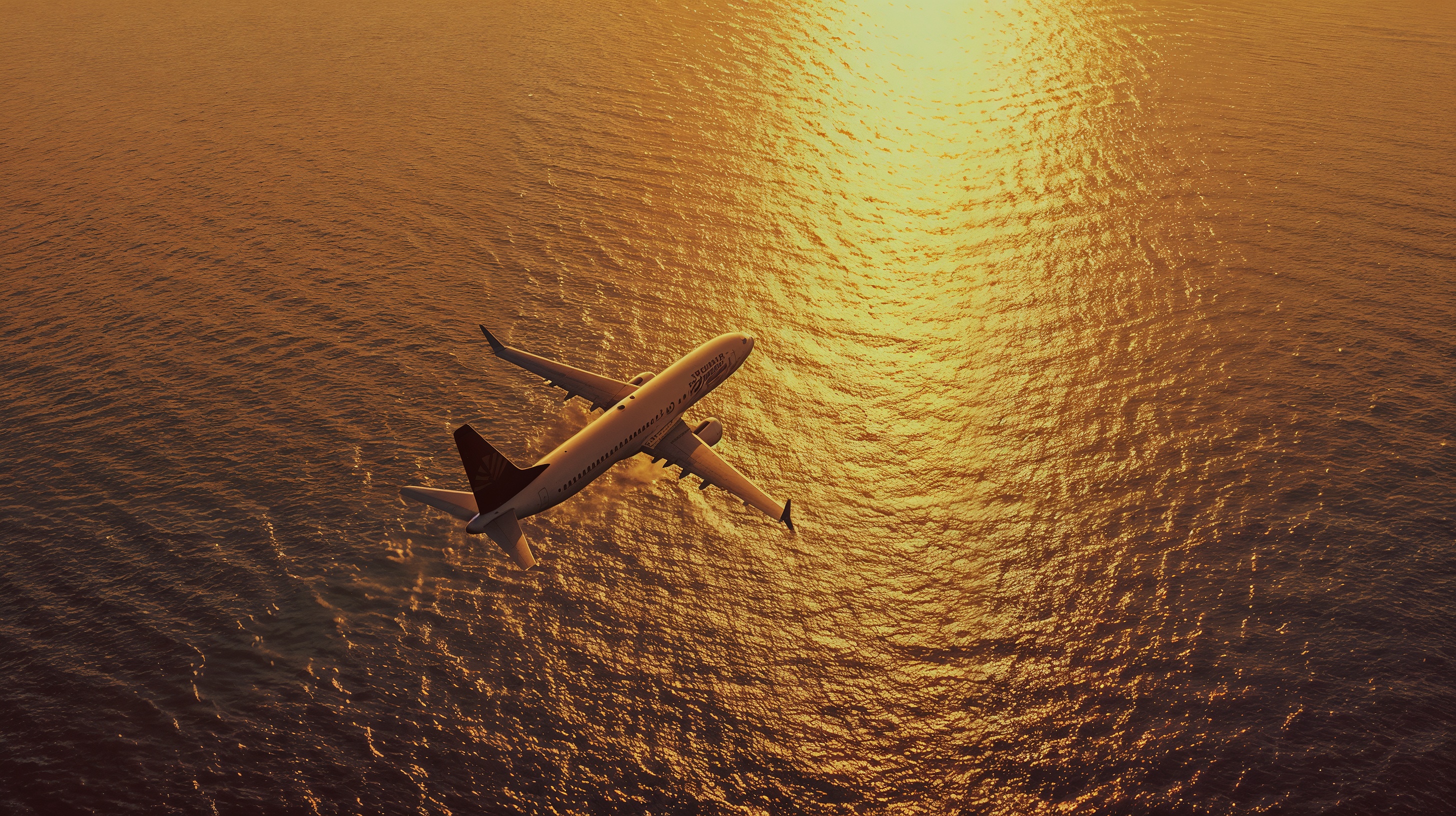 A passenger plane flies over the sea during the golden hour in a cinematic, photorealistic top-down perspective. The warm sunlight reflects on the water.