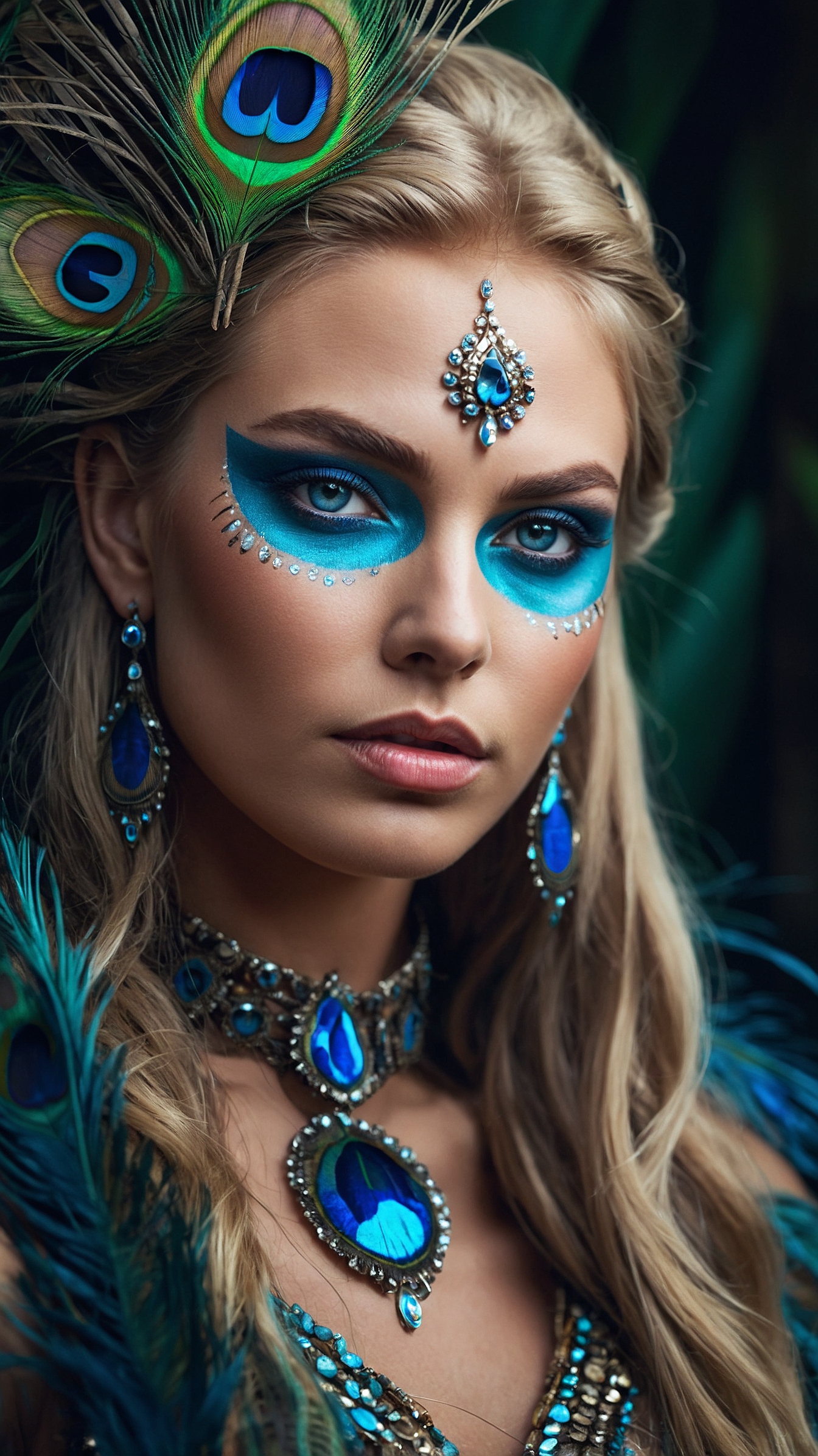 A beautiful woman with peacock-blue eyes wears sapphire and turquoise jewelry and poses among peacocks with confident grace. She styles her long blonde hair with a feather and wears royal blue makeup that matches the vivid tones around her. The elegant scene blends luxury, nature, and bold fashion in a radiant, peacock-inspired composition.