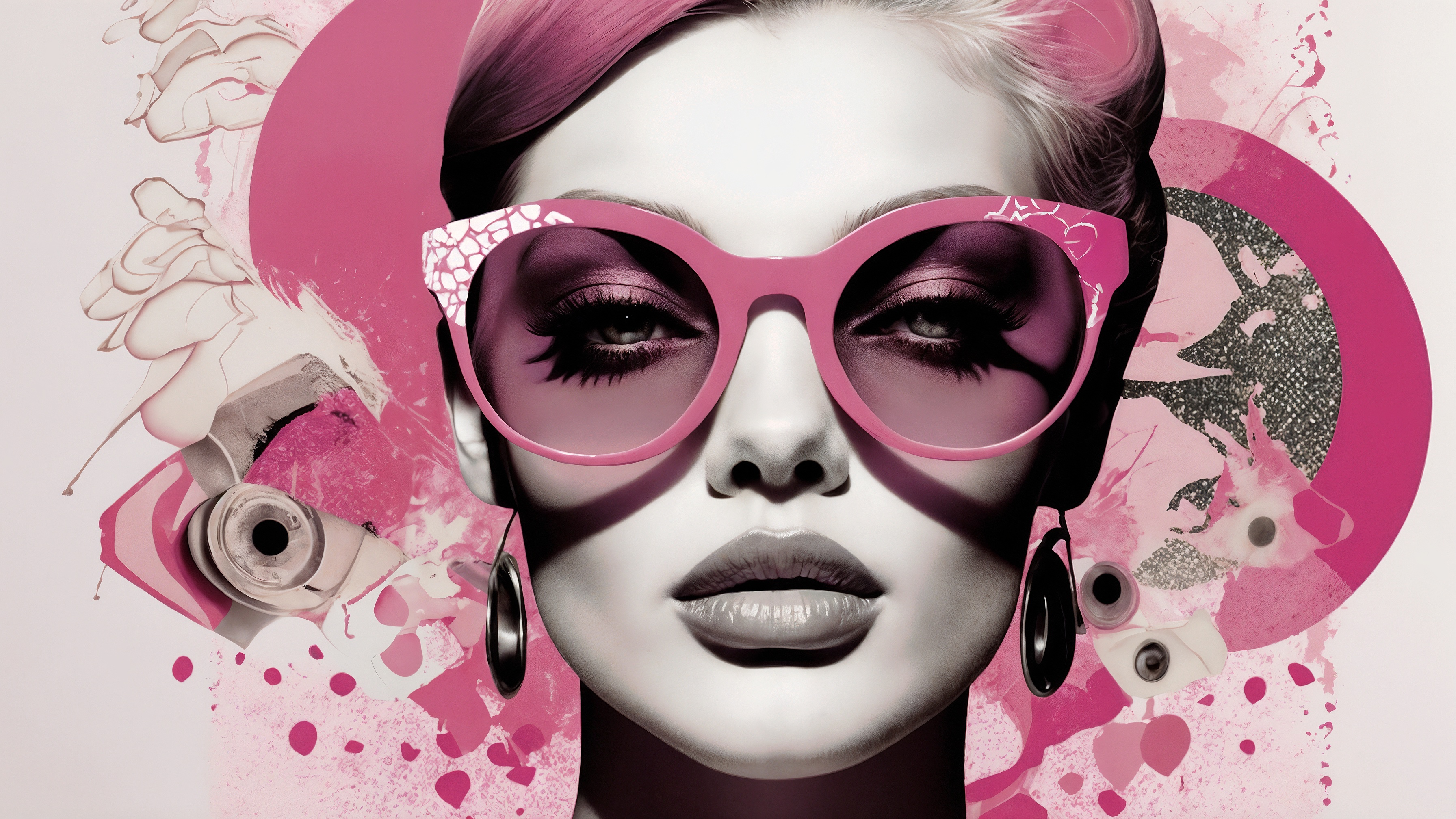 A stylish woman wears pink sunglasses and poses confidently with highlighted eyes and makeup in bold pink tones. Her hair flows elegantly, blending into the pink and white floral collage background with artistic, fashion-forward flair. Pink-tinted shadows enhance depth and contrast, adding sophistication to the fashion illustration’s vivid palette.