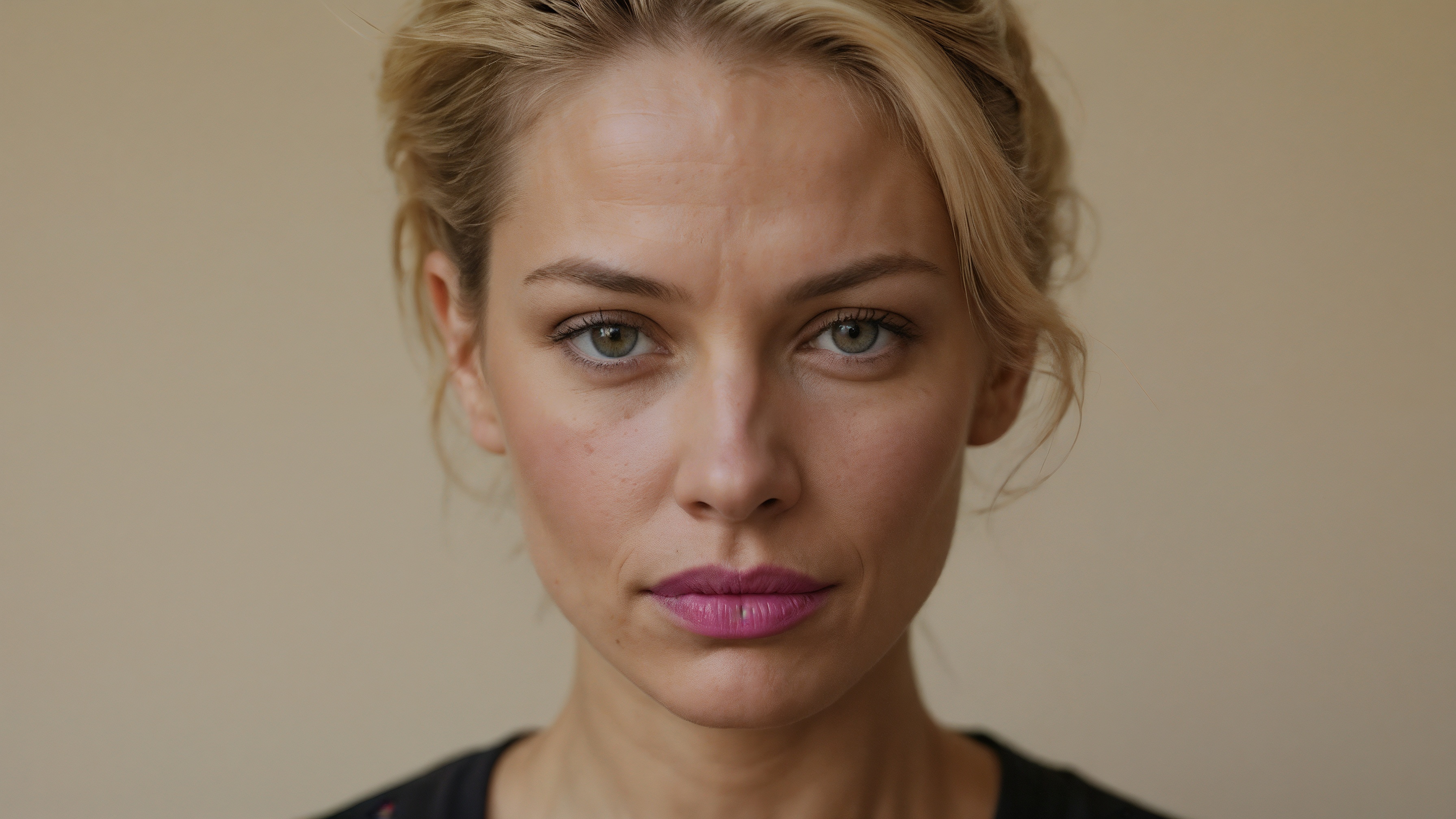A blonde woman in her late thirties faces the camera. She wears short hair with black and pink lipstick. Wrinkles surround her eyes as she gazes forward. A beige background frames her neutral expression with subtle elegance.