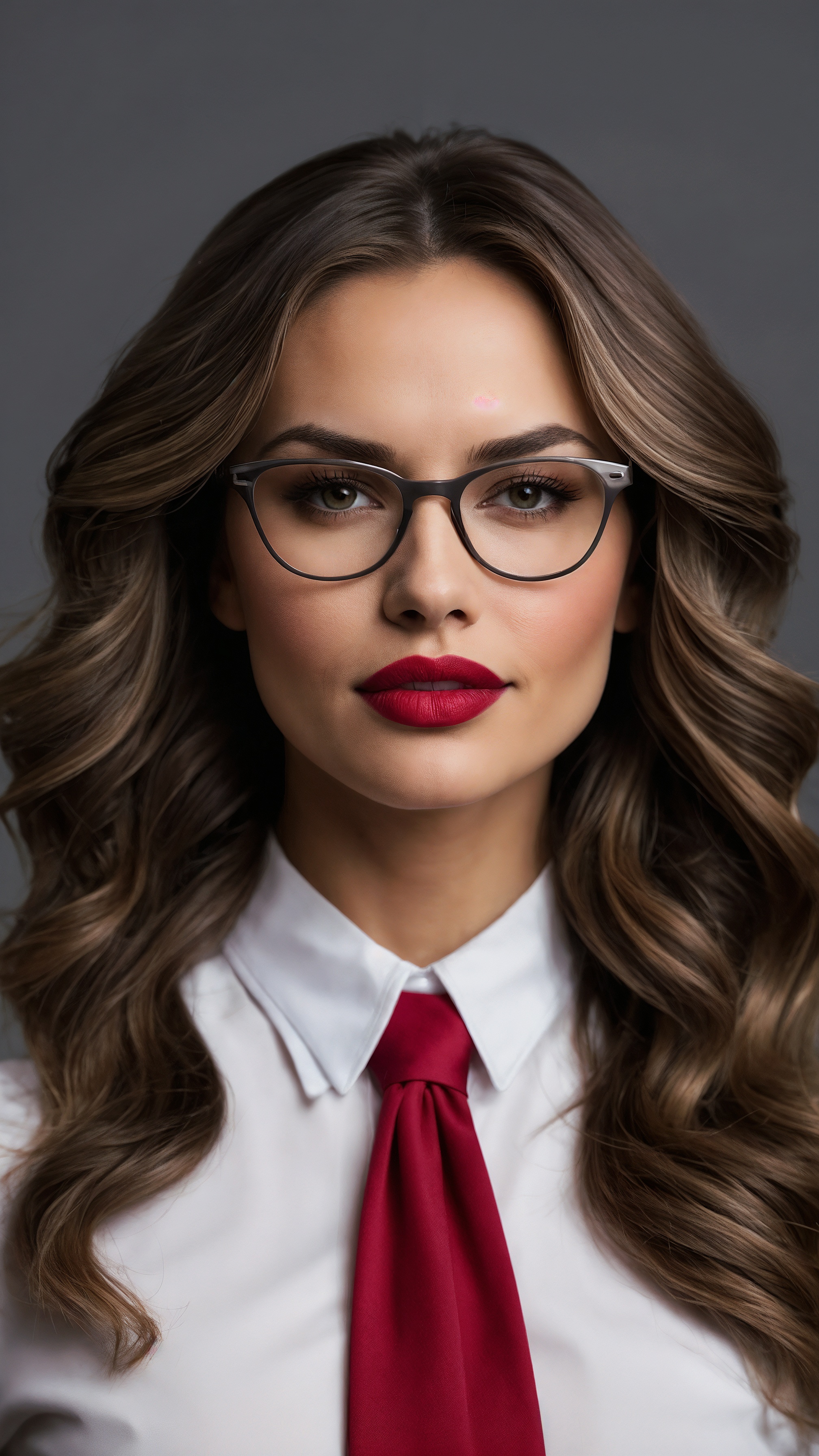 Free AI Image: Portrait of a beautiful young woman wearing a white shirt and red tie, with glasses in a black frame, and long brown hair styled in waves. She has a confident look, with bright makeup and glossy lips, set against a gray background with studio lighting, in a professional photograph.